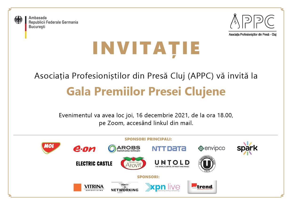 Astfel, Gala va fi transmisă online joi, 16 decembrie 2021 începând cu ora 18:00, pe pagina de Facebook ”Asociația Profesioniștilor din Presă-Cluj (APPC)”.