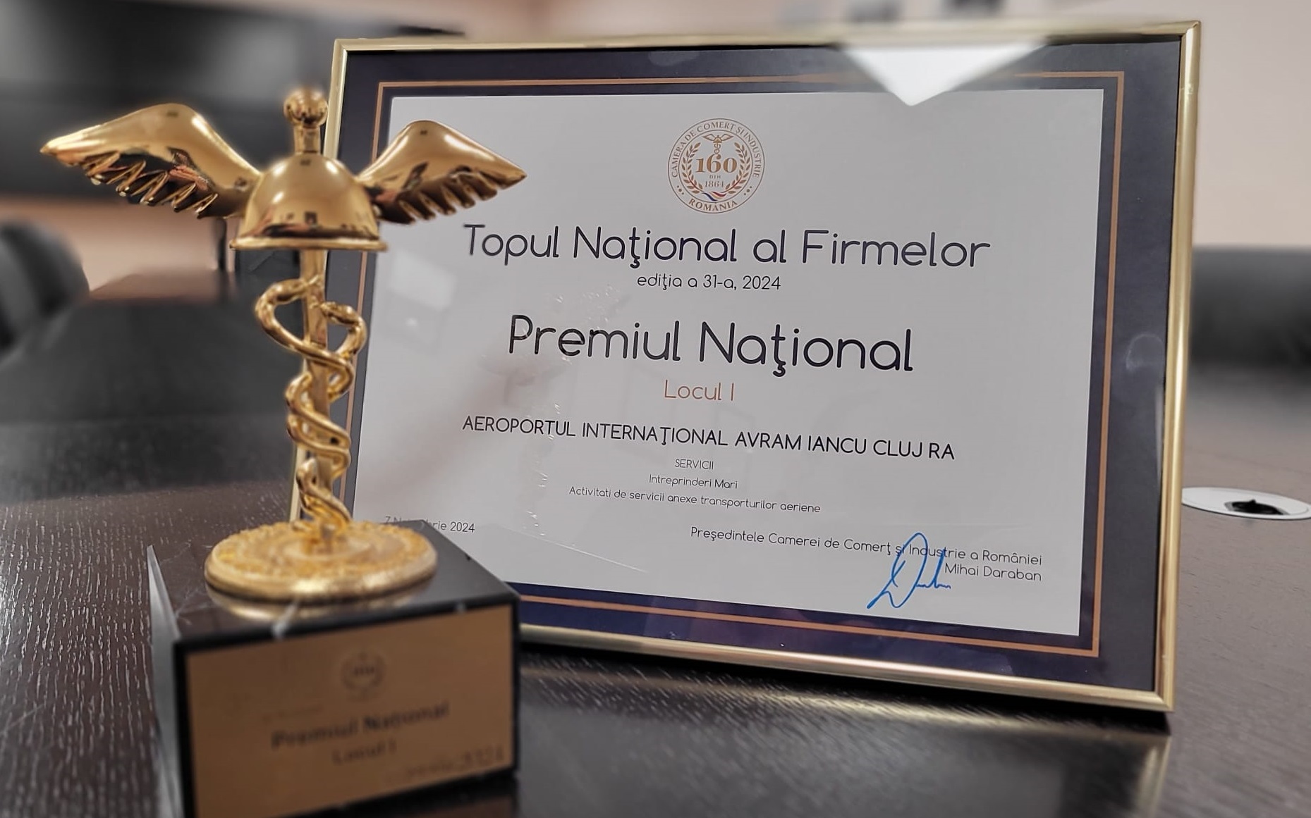 ,,În cadrul celei de-a 31 ediţii a Galei Topul Național al Firmelor organizată de Camera de Comerț și Industrie a României, la data de 7 noiembrie 2024, Aeroportul Internaţional Cluj a obţinut Locul_I în clasamentul naţional al firmelor evaluate de aceasta instituţie de prestigiu, în baza rezultatelor economice din anul 2023.