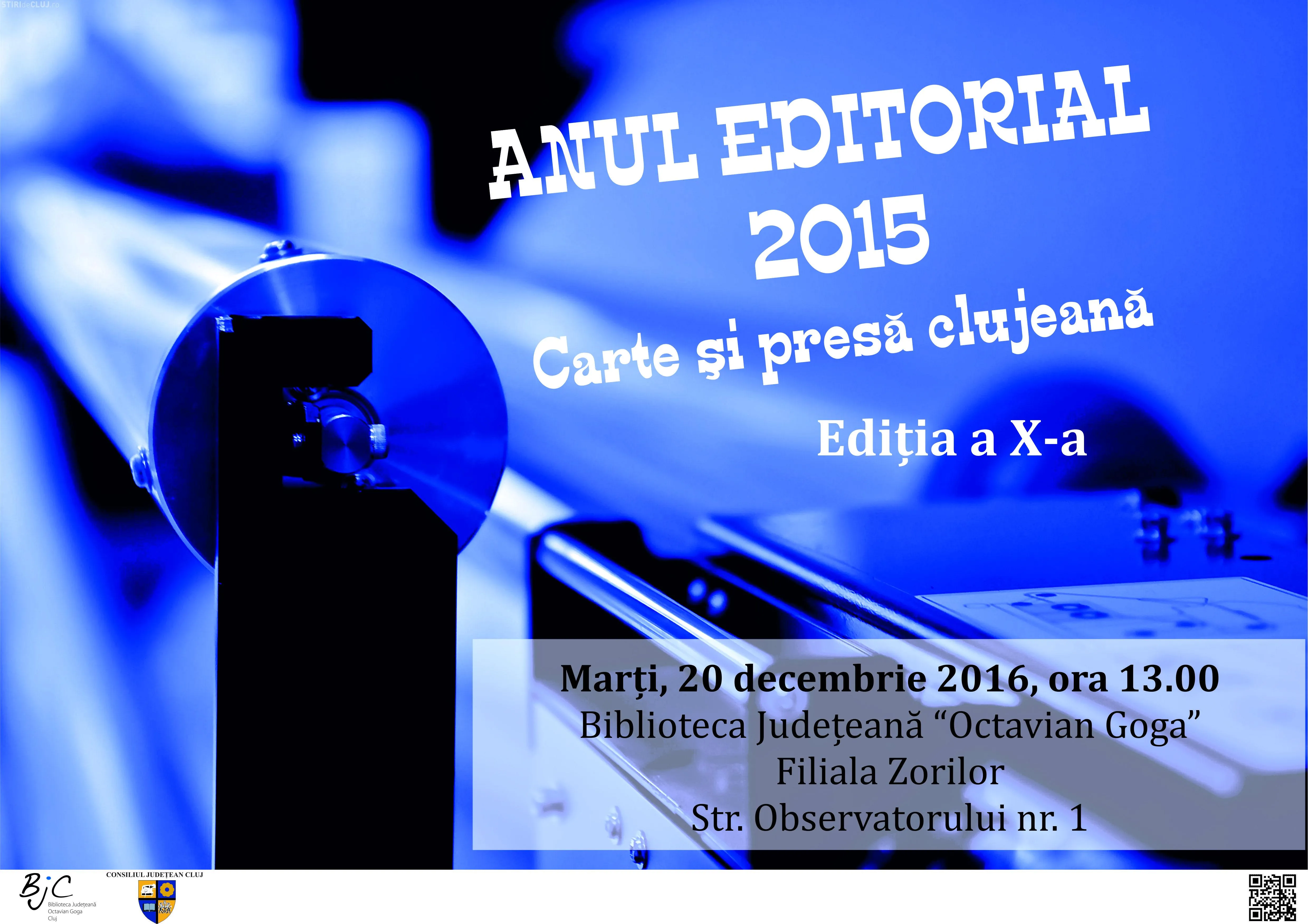 Biblioteca Judeţeană ”Octavian Goga” Cluj a organizat marţi, 20 decembrie 2016, festivitatea de premiere a celor mai bune publicaţii tipărite în judeţul Cluj în anul 2015, în cadrul Anului Editorial Clujean, ajuns la ediţia a X-a.