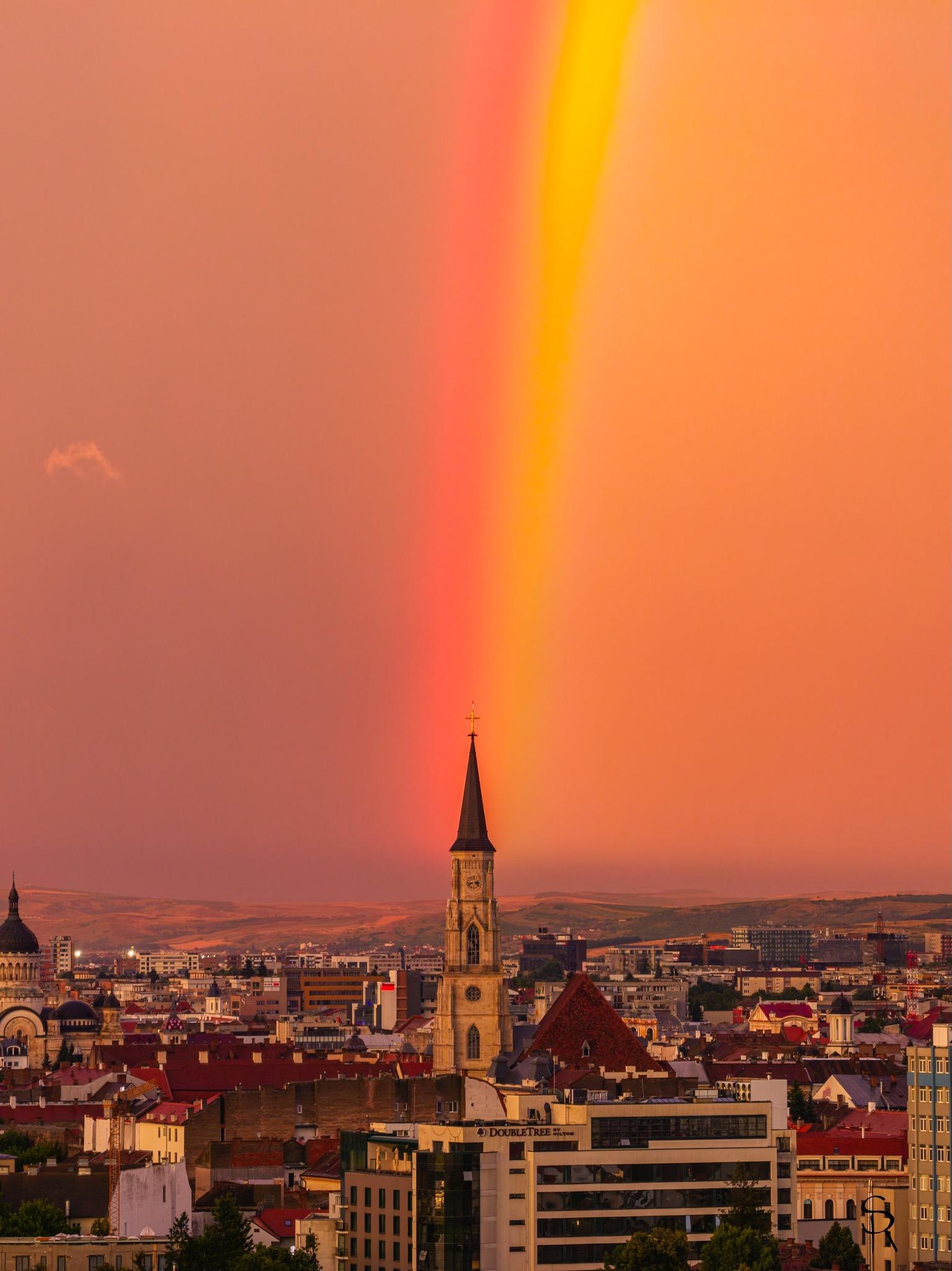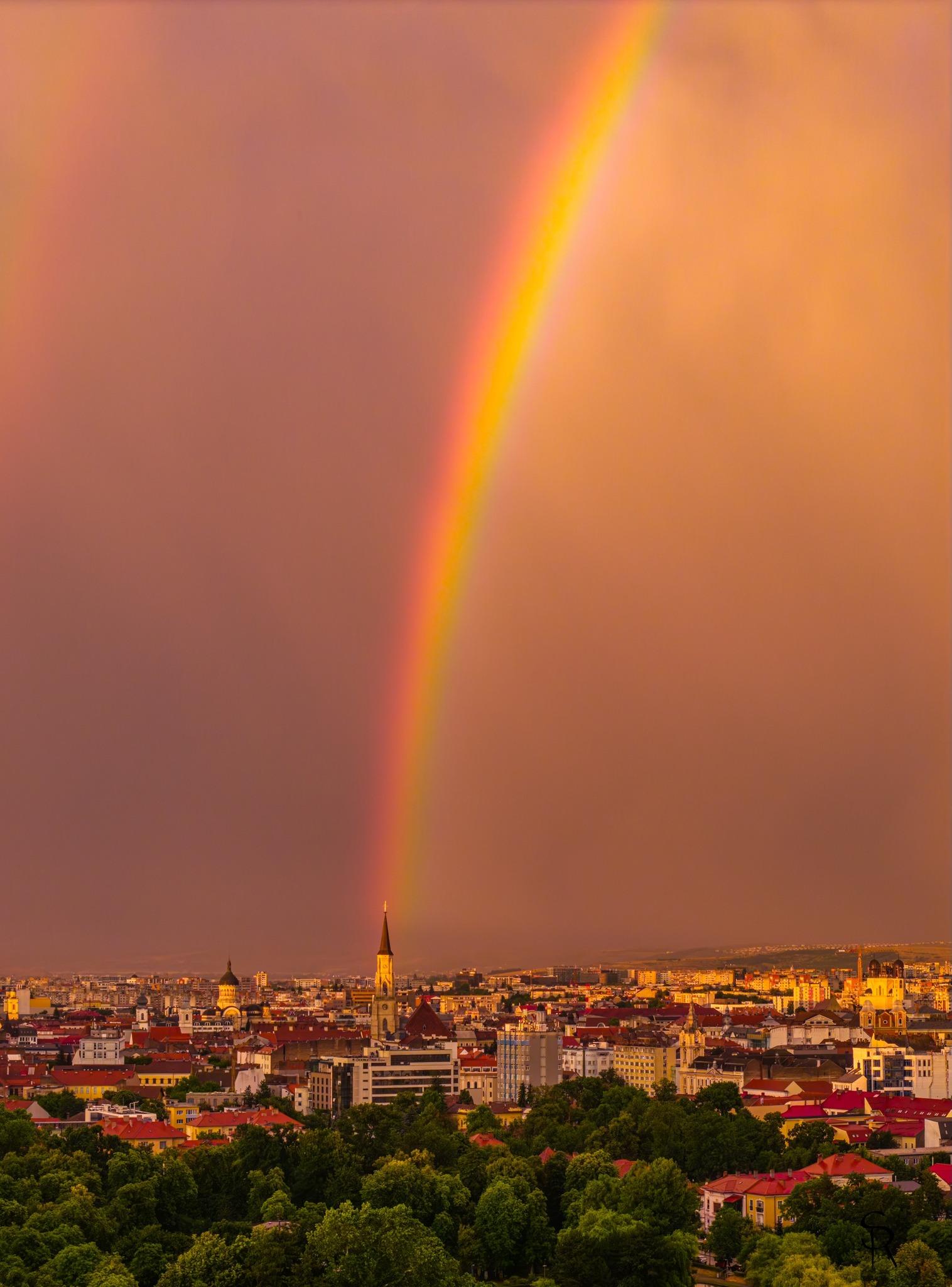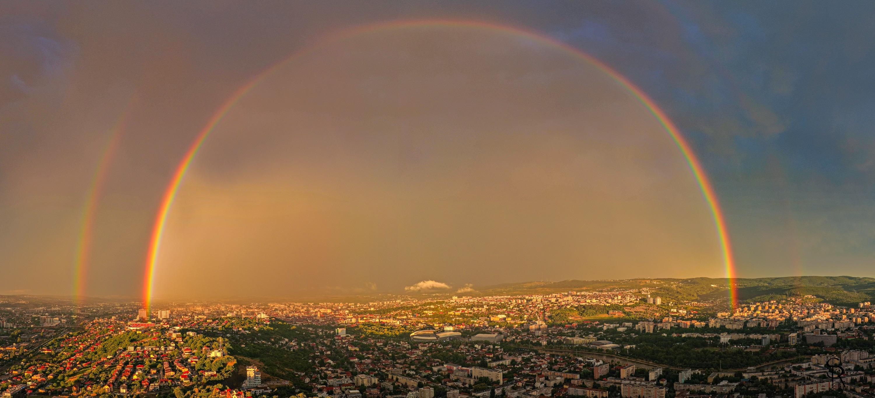 Fotografiile, realizate din aer, arată cerul în nuanțe rare de violet, portocaliu și galben, într-un contrast spectaculos cu norii grei care se retrăgeau peste oraș. Dublul curcubeu — un fenomen meteorologic rar, vizibil doar în condiții speciale de lumină și umiditate — s-a format perfect deasupra Clujului, într-un cadru ce pare mai degrabă pictat decât real.