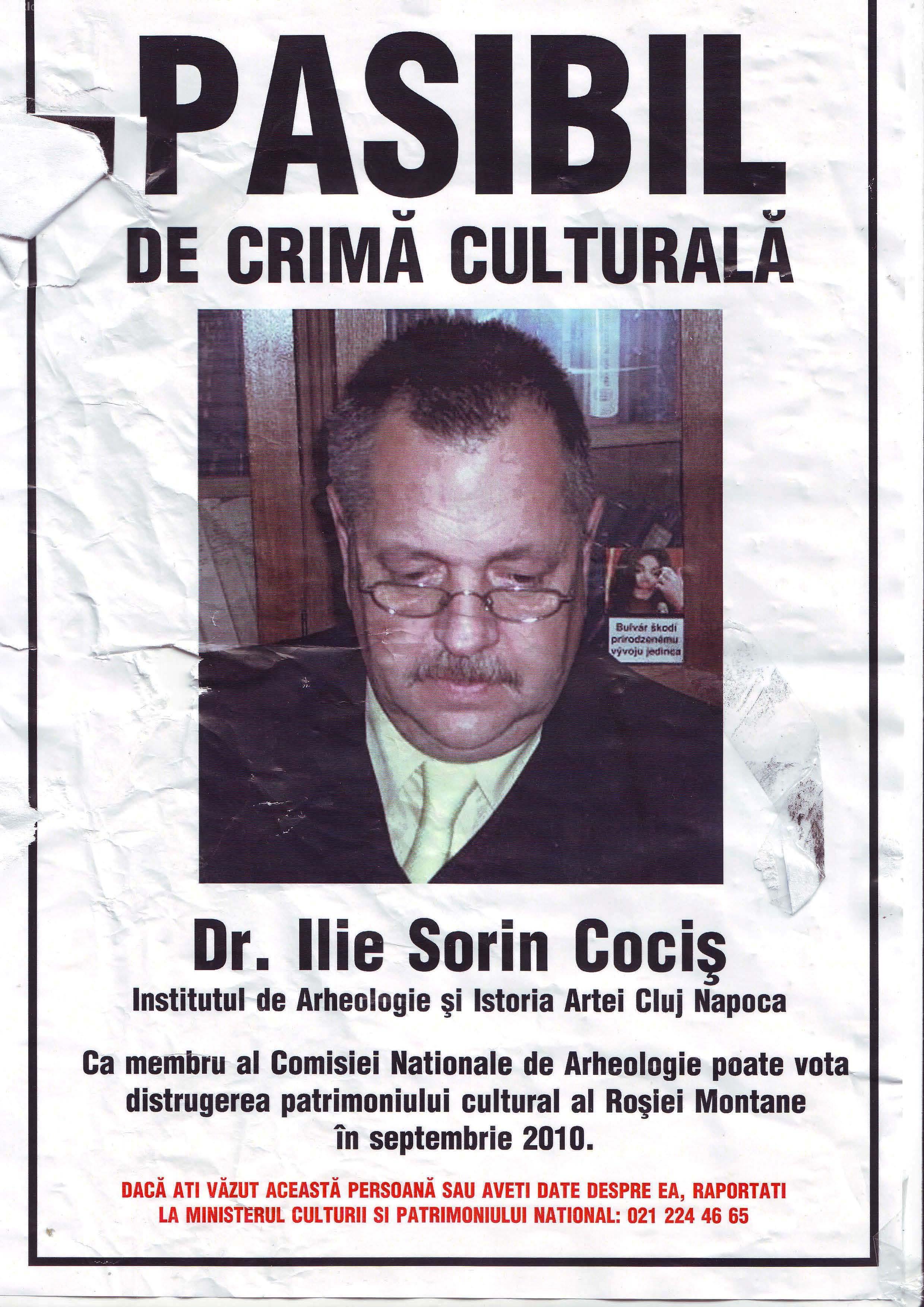 Fotografia cercetatorului clujean Sorin Cocis, de la Institutul de Arheologie si Istoria Artei din Cluj-Napoca, a aparut in mai multe afise, in care se spune ca esgte "Pasibil de Crima Culturala", cu referire la Rosia Montana.