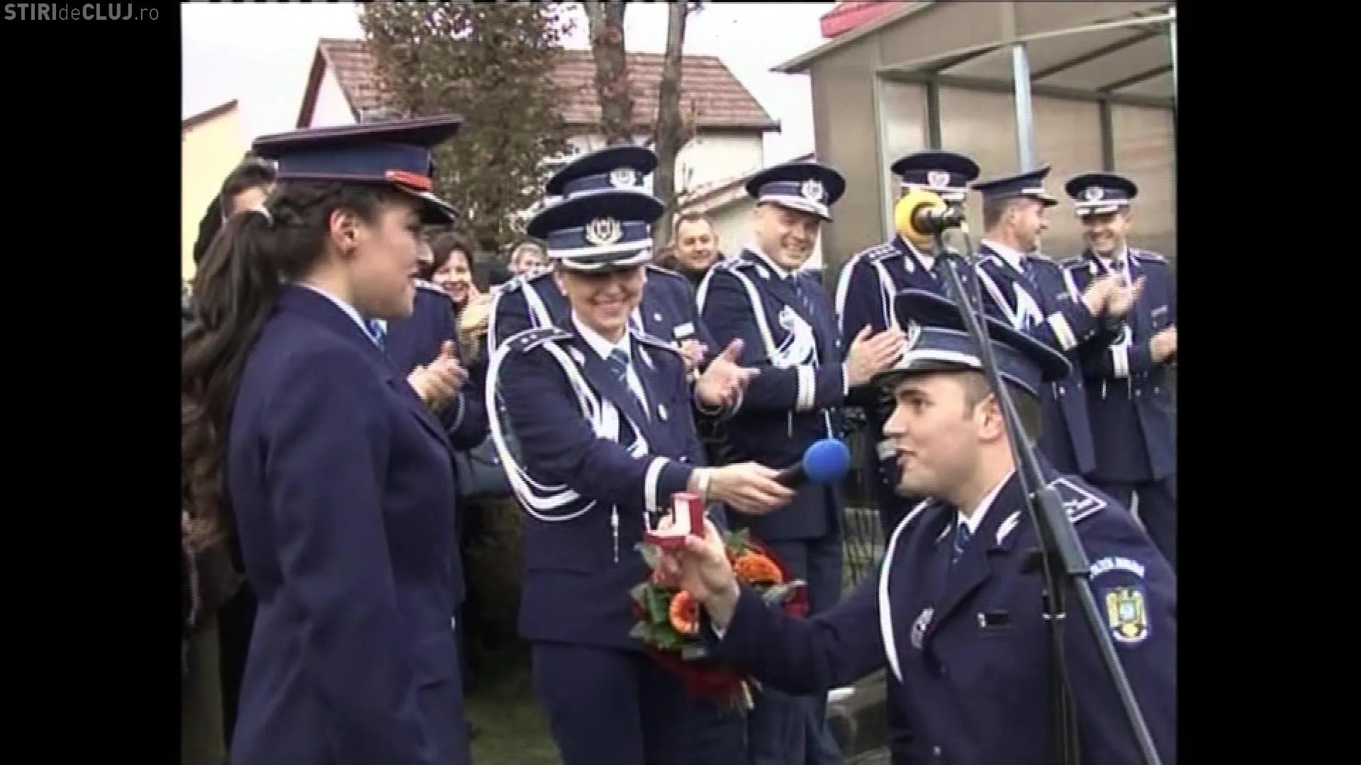 Un polițist din Cluj-Napoca și-a surprins iubita, absolventă a Școlii de Agenți de Poliție din Cluj-Napoca, și a cerut-o în căsătorie în timpul ceremoniei de depunere a jurământului militar de către ”bobocii” școlii.