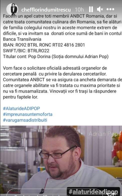 Florin Dumitrescu cere să se facă dreptate pentru Adrian Pop și o strângere de fonduri pentru acesta. ”Facem un apel către toți membrii ANBCT România, dar și către toată comunitatea culinară din România, să fie alături de familia colegului nostru în aceste momente extrem de dificile și vă invităm să donați orice sumă de bani. Vom face o solicitare oficială adresată organelor de cercetare penală cu privire la derularea cercetărilor. Comunitatea ANBCT se va asigura că ancheta demarată de către organele abilitate va fi tratată cu maximă prioritate și nu va fi mușamalizată. Vinovații vor fi trași la răspundere pentru faptele lor”, a scris Florin Dumitrescu.
