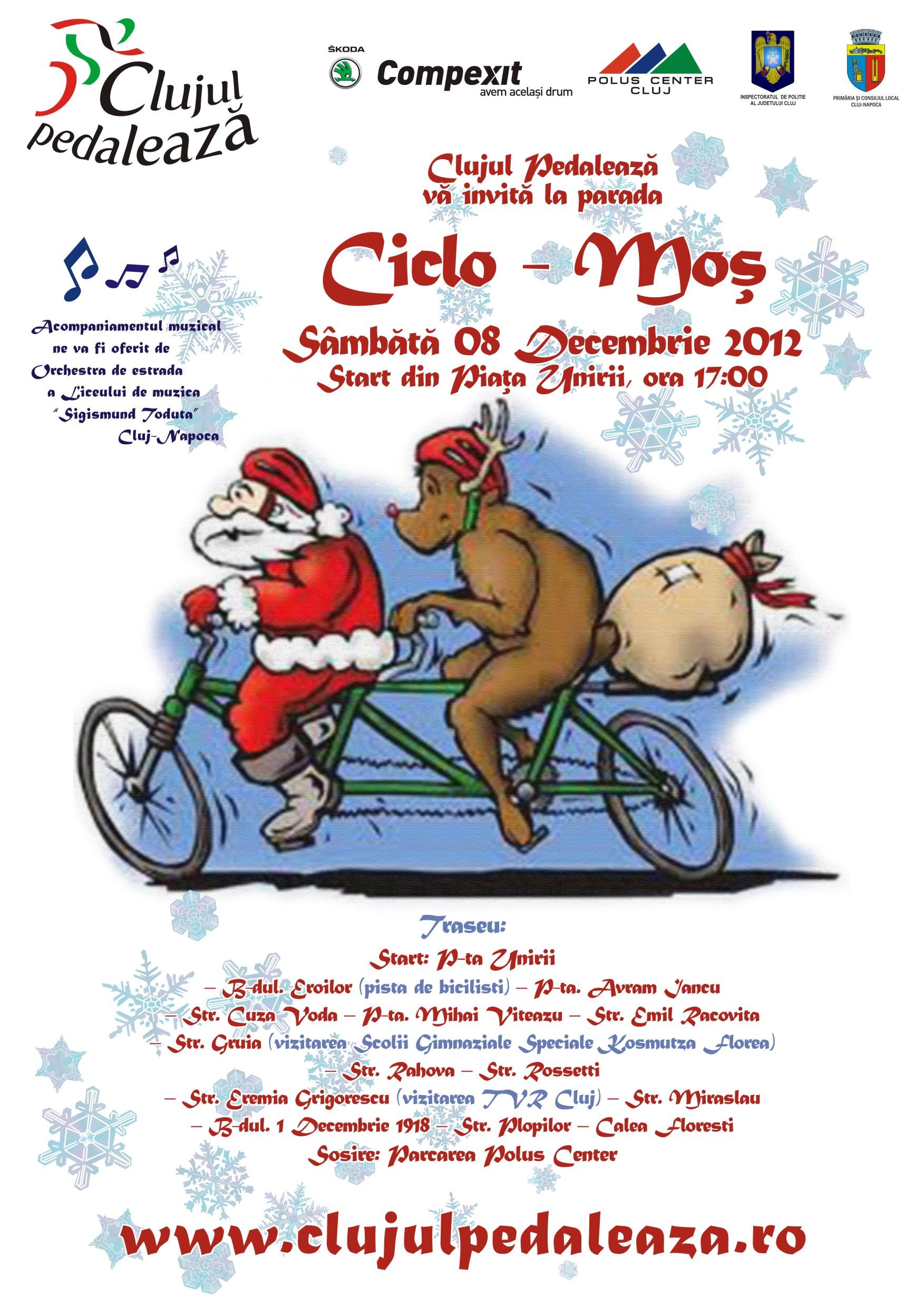 ”Anul trecut tare bine m-am simtit la voi in Cluj, mi-ati fost de mare ajutor, asa ca m-am hotarat, tot pe bicicleta voi veni la Cluj! Va rog pe voi de la Clujul Pedaleaza, sa adunati ciclo-mosii clujeni pe data de 8 decembrie in Piața Unirii, la ora 17:00. Impreuna vom porni la impartit de dulcuri si jucarii pentru copii”, au precizat organizatorii acțiunii, Clubul Sportiv Clujul Pedalează.