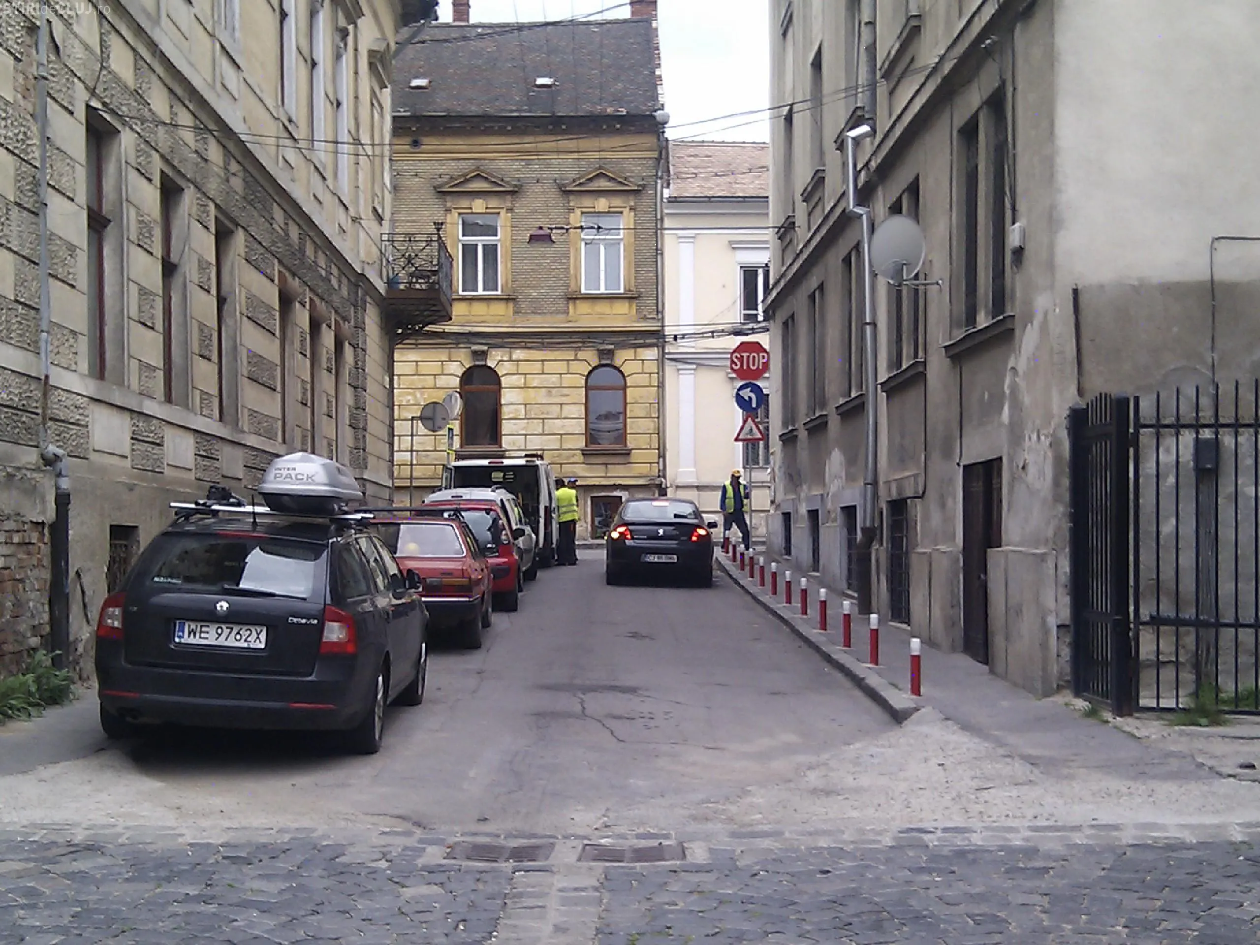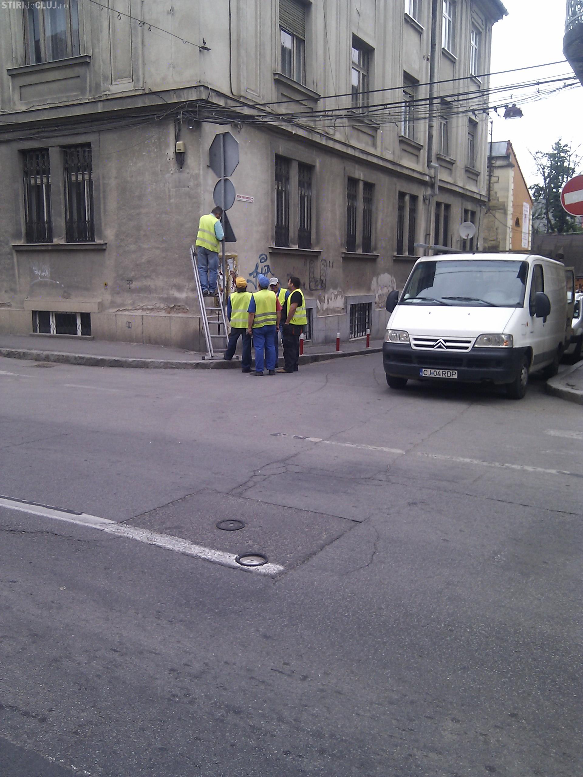Scena a fost surprinsa la ora 9.45. Cinci muncitori ai RADP Cluj insotiti de un sofer se ocupau de montarea unui indicator rutier: "Atentie biciclisti".