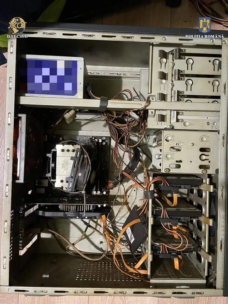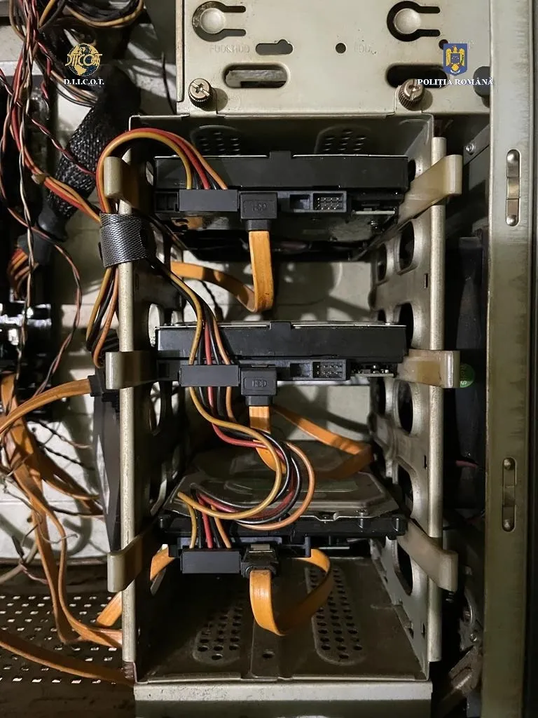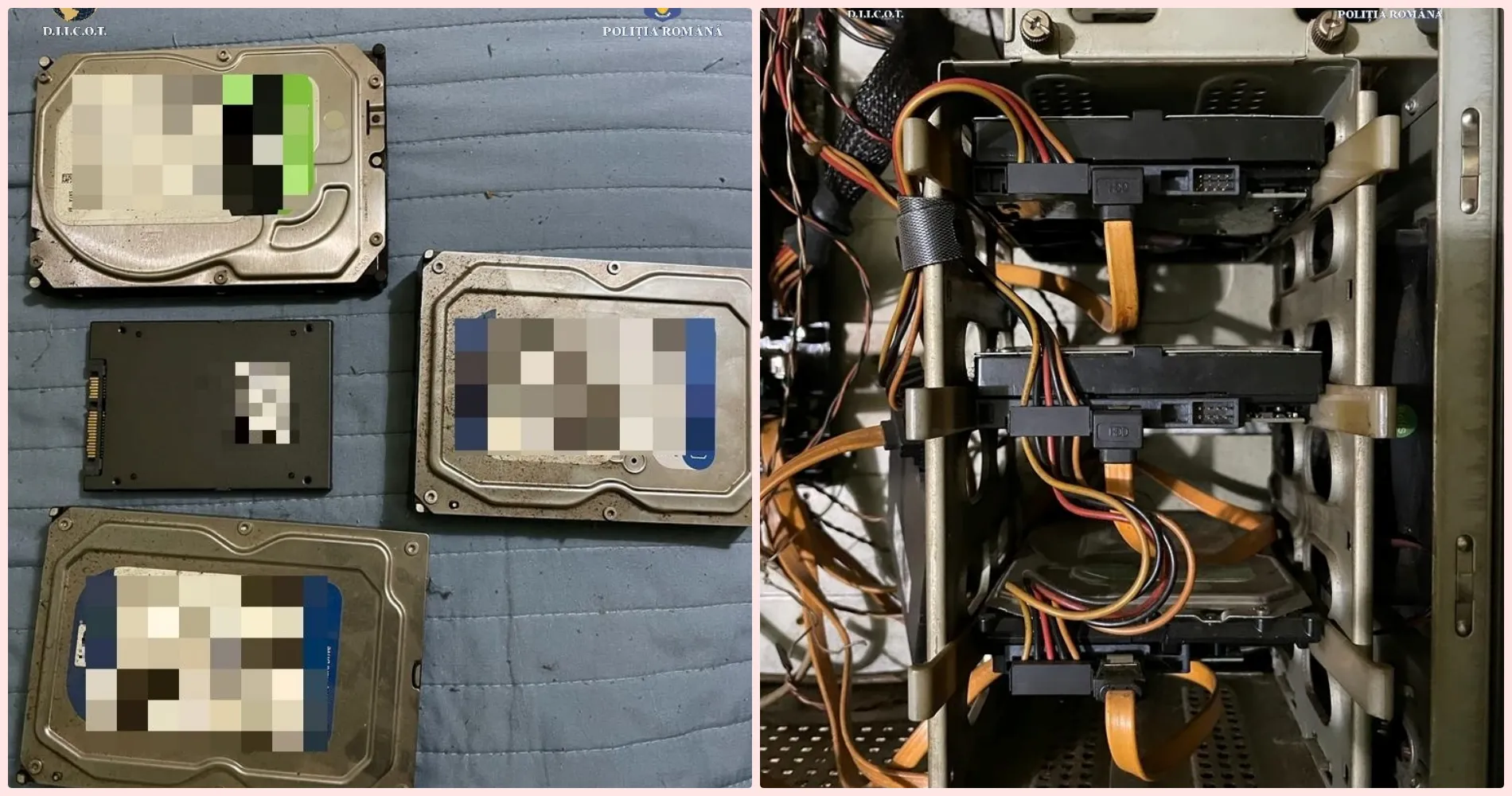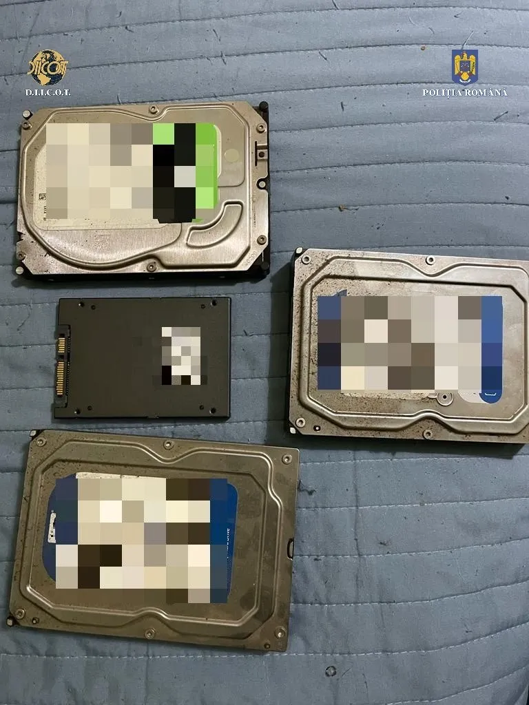 În urma percheziției, au fost descoperite și ridicate 14 dispozitive de stocare a datelor informatice de tip HDD, SSD și memory stick USB, cu o capacitate totală de stocare de 8TB.