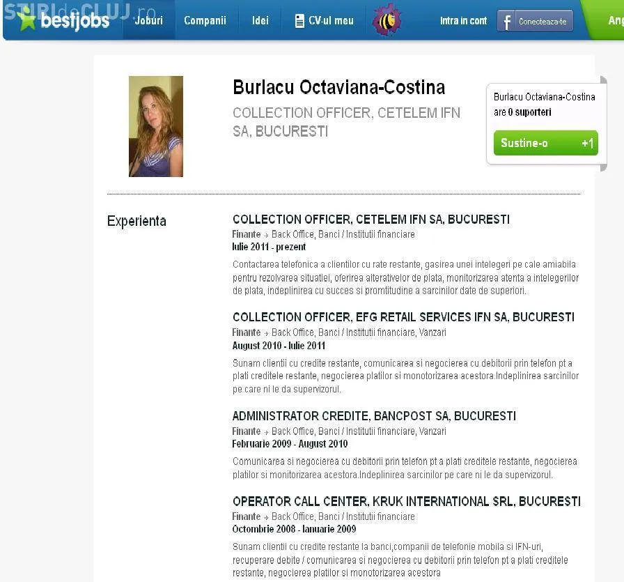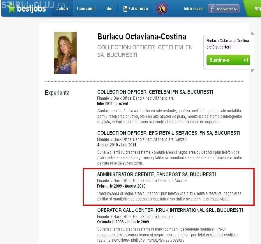 Unul dintre angajaţii Bancpost pomeniţi în sentinţa Judecătoriei Dej, Octaviana Burlacu este absolventă a Facultăţii de Teologie Ortodoxă din Bucureşti şi a Facultăţii de Management. În CV -ul acesteia se arată că, în perioada februarie 2009 - august 2010, a lucrat la Bancpost SA - Bucureşti, unde avea ca şi sarcini de serviciu ”comunicarea şi negocierea cu debitorii prin telefon pentru a plăti creditele restante, negocierea plăţilor şi monitorizarea acestora”.