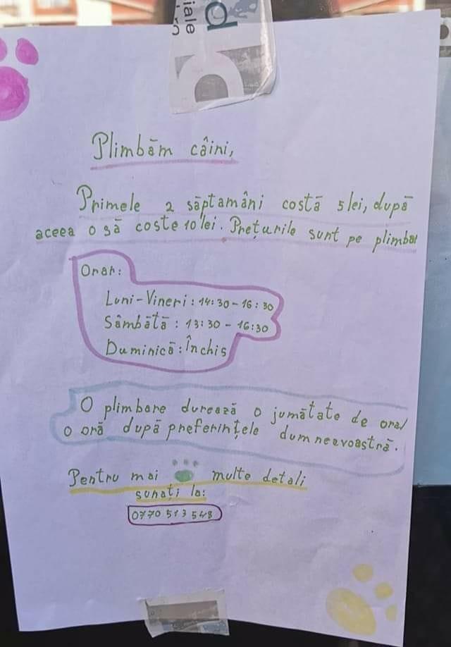 Două fetițe au redactat un afiș prin care își promovează afacerea și anunță că plimbă căței în Florești contra cost.