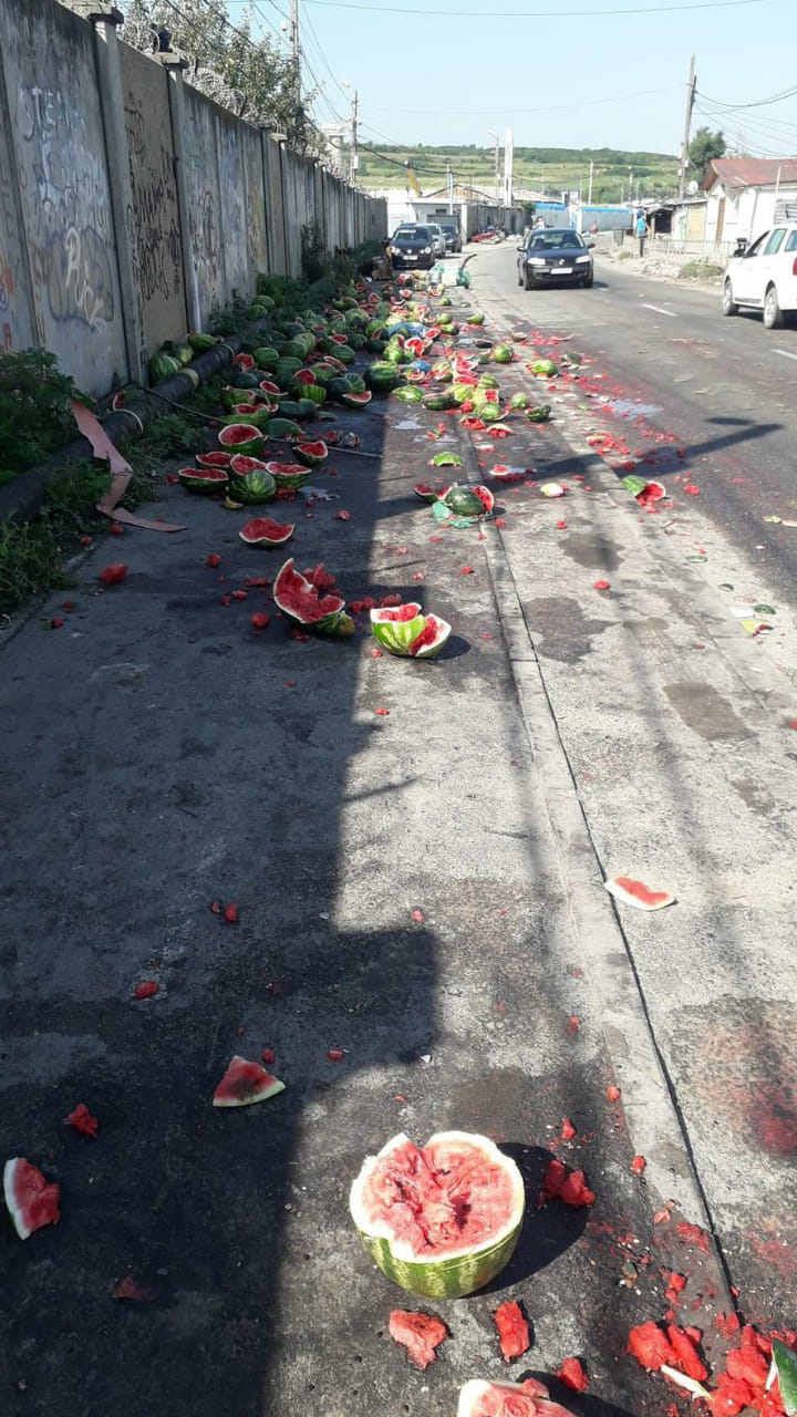 Nu este clar cum au ajuns acolo legumele, dacă au fost aruncate de cei care au umplut Clujul cu tarabe pentru că s-au stricat sau a fost un incident rutier și pepenii au căzut pe jos.