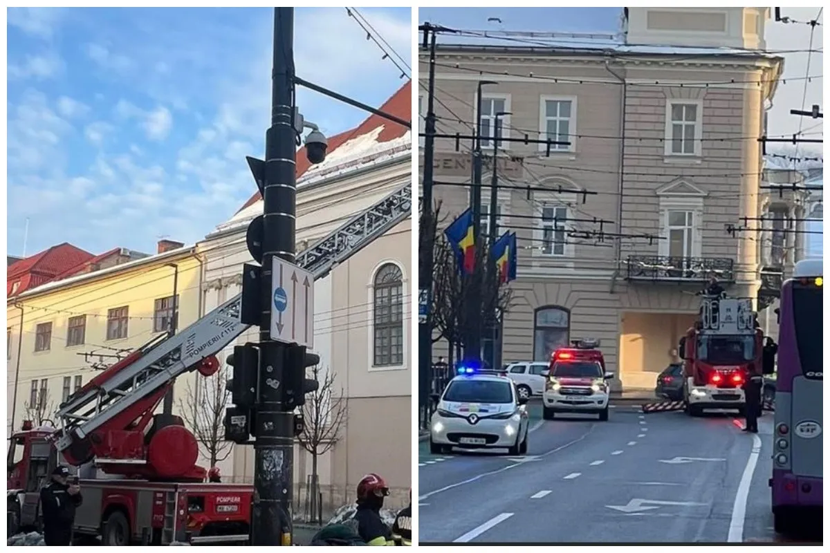 Circulația a fost oprită pe strada Regele Ferdinand din Cluj-Napoca. Operațiune spectaculoasă la mare înălțime a pompierilor FOTO