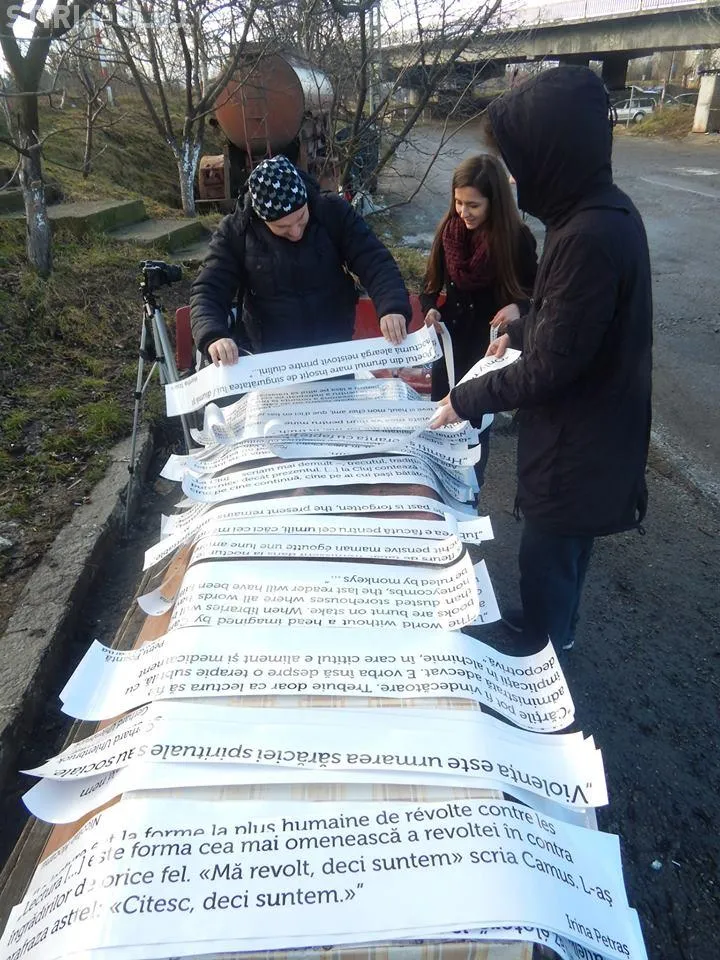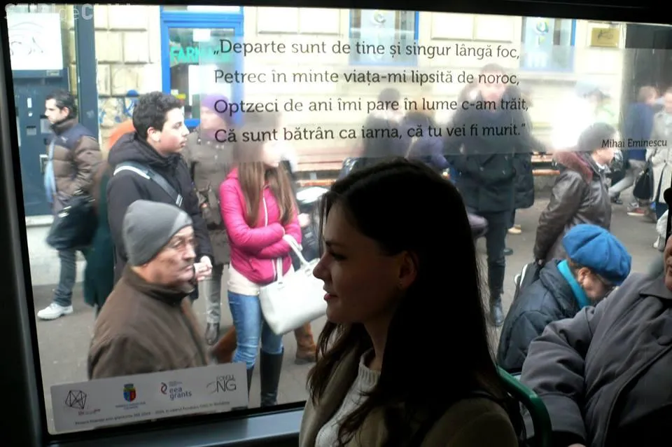 ”Pe parcursul zilei în care sărbătorim 165 de ani de la nașterea lui Mihai Eminescu am lipit în autobuze mai multe asemenea fragmente, care vor rămâne în spațiul public timp de 1 lună. În 50 de autobuze vor fi afișate fragmente din operele unor autori clasici și contemporani, și vor fi împărțite semne de carte”, precizează reprezentanții Cluj Capitală Europeană a Tineretului 2015, organizatorii evenimentului cultural.