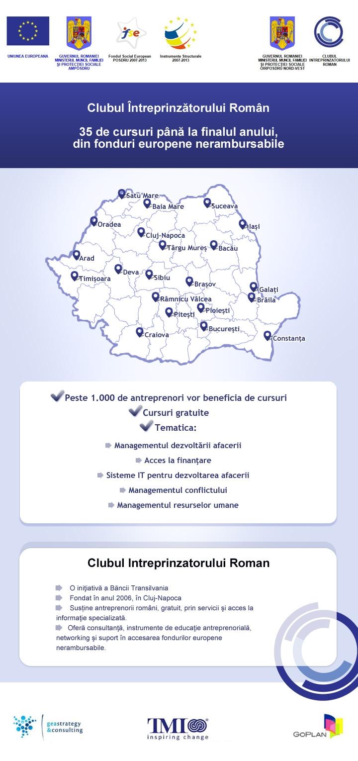 CIR estimează că, până la finalul anului, 1.000 de întreprinzători locali vor participa la cursurile oferite de Club, gratuit, tematica fiind de interes - de la Strategie şi antreprenoriat, Gestiunea financiară a afacerii, Managementul dezvoltării afacerii, Acces la finanţare, Sisteme IT pentru dezvoltarea afacerii, Managementul conflictului, până la Managementul resurselor umane. Acestea sunt susţinute, de asemenea, de consultanţi ai companiilor partenere proiectului, şi anume: SC TMI Training & Consulting SRL – care are ca obiect de activitate instruirea şi consultanţa managerială, SC GEA Strategy & Consulting SA – specializată în consultanţă şi evaluare strategică a firmelor, respectiv SC Go Plan SRL – companie care oferă servicii de consultanţă pentru afaceri şi management, în vederea accesării fondurilor europene.