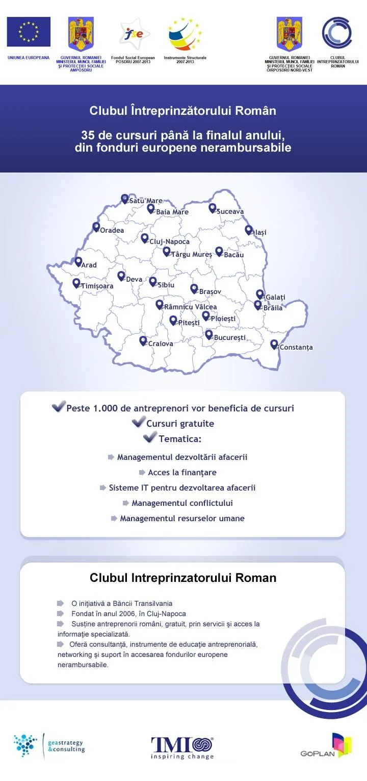 Sesiunile de training se desfăşoară în cadrul proiectului “Competenţe manageriale în poli de creştere şi dezvoltare şi Antreprenoriat de viitor în poli de competitivitate”, cofinanţat din Fondul Social European, prin Programul Operaţional Sectorial Dezvoltarea Resurselor Umane 2007–2013. Valoarea totală a acestuia este de 1,5 milioane euro. In total, proiectul cuprinde 150 de sesiuni de training pentru antreprenori din diverse oraşe din ţară şi se va desfăşura până în luna ianuarie 2014. Startul a fost dat la începutul acestui an, iar până acum peste 500 de antreprenori au beneficiat de 15 cursuri, organizate în tot atâtea localităţi.