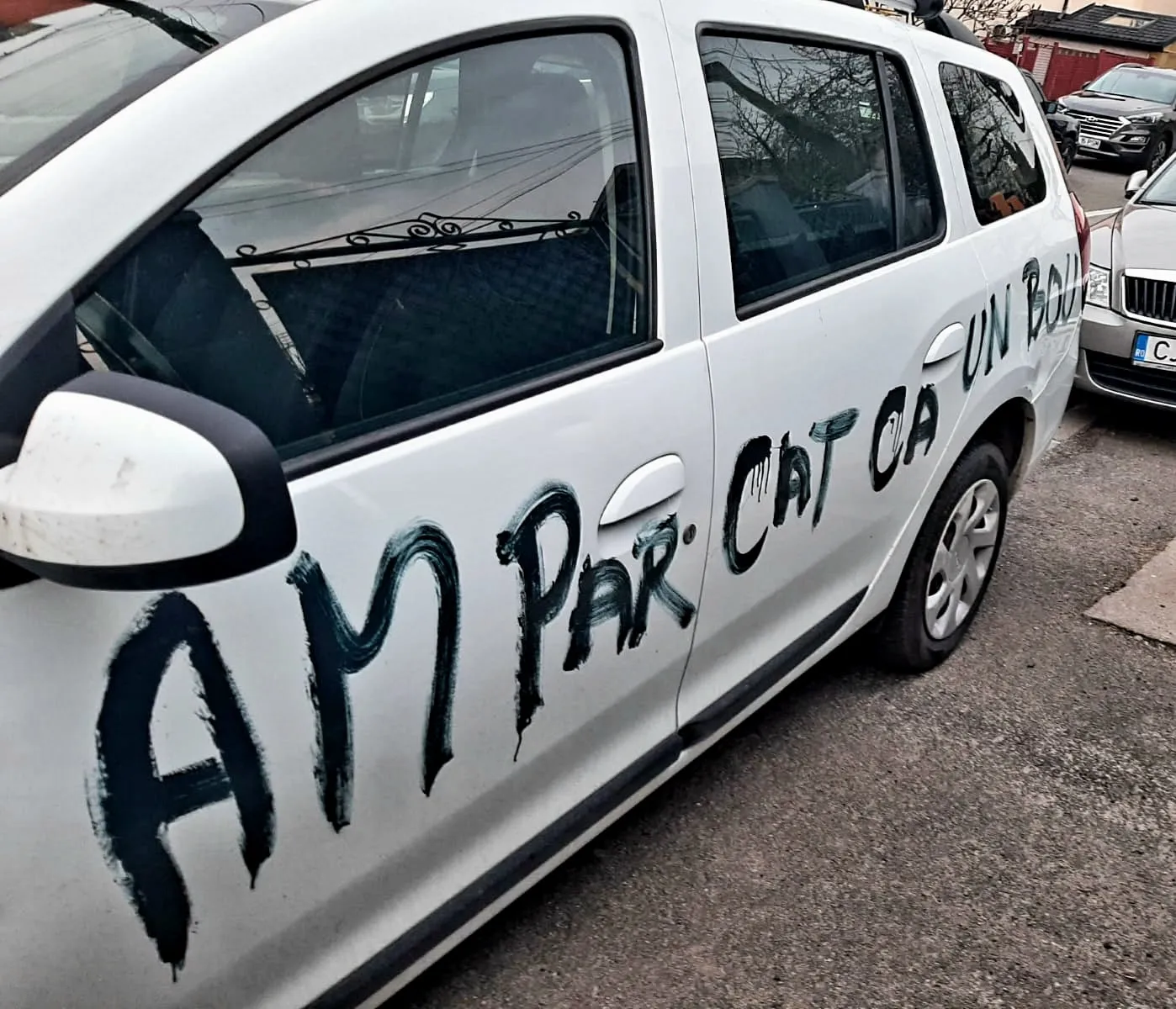 Pe mașină s-a scris și pe lateral mesajul ”Am parcat ca un bou!”.