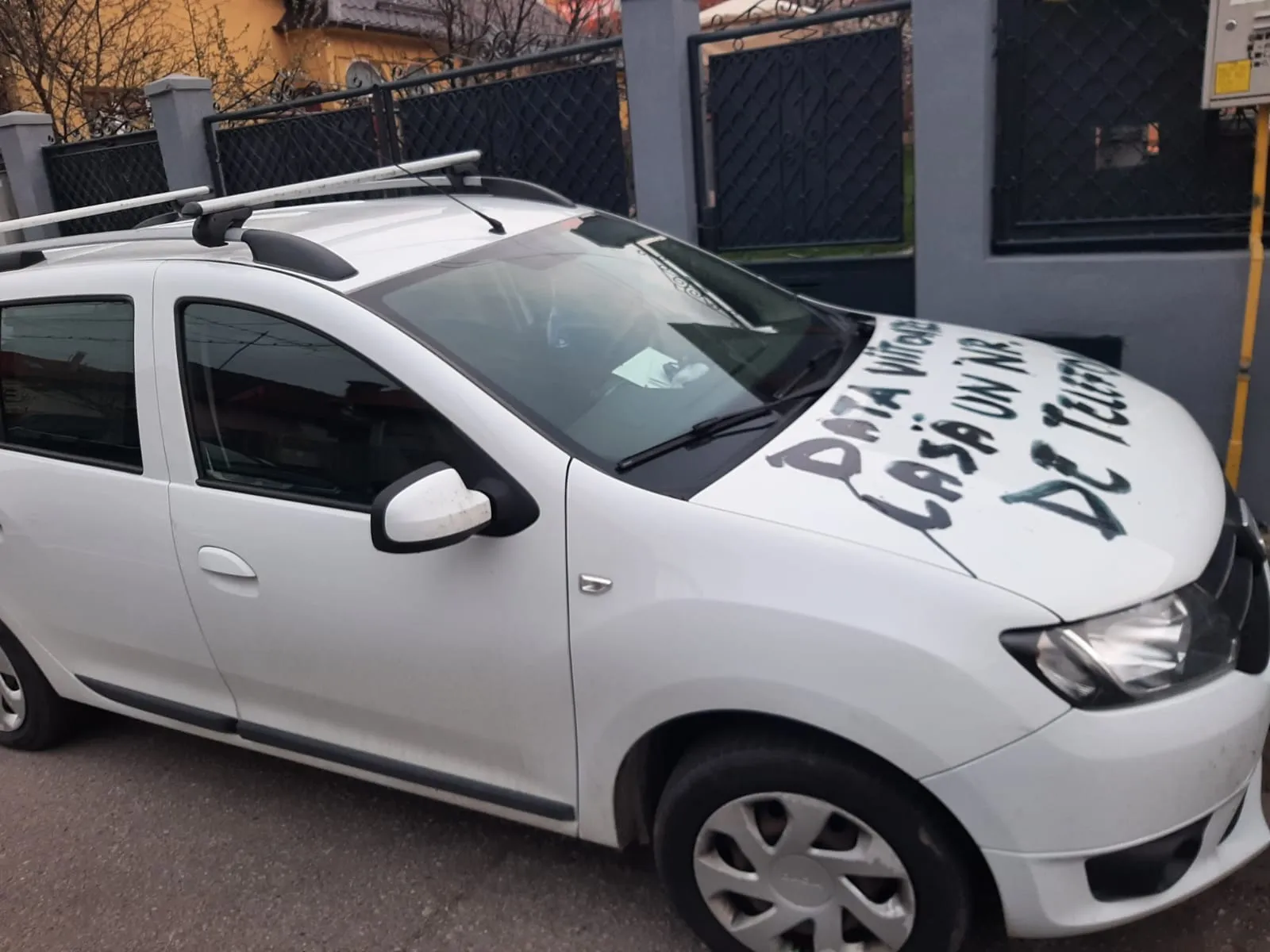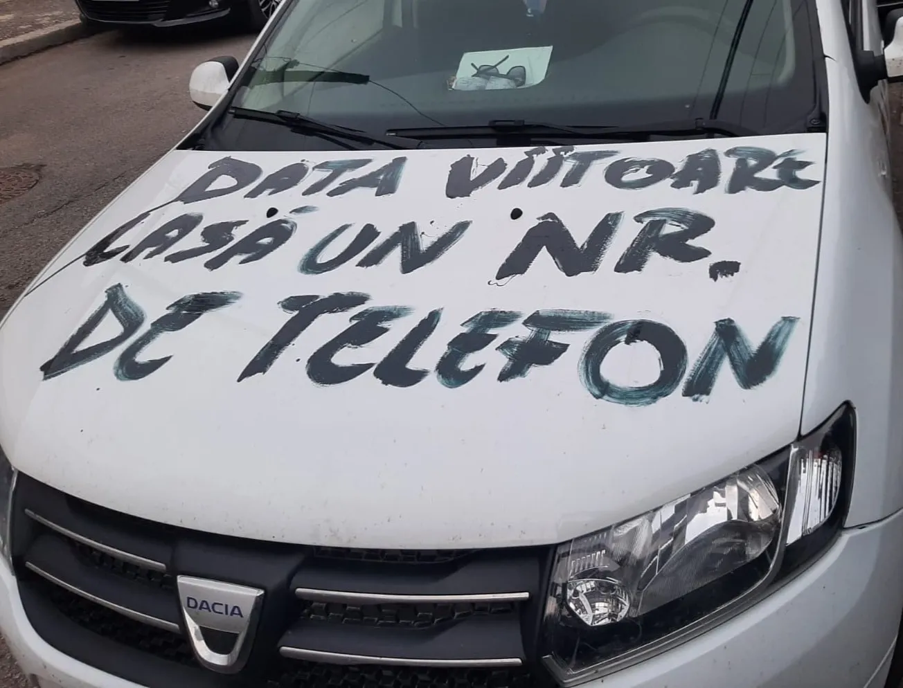 Un șofer a parcat pe locul greșit, în cartierul Gruia, și cineva i-a scris cu o pensulă și cu vopsea că ar fi trebuit să lase un număr de telefon.