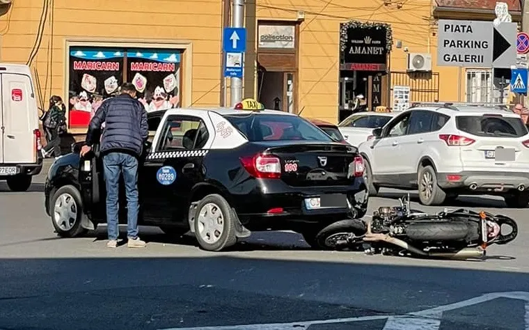 Cluj: Accident în Piața Mihai Viteazul. Un motociclist și un taxi au fost implicați