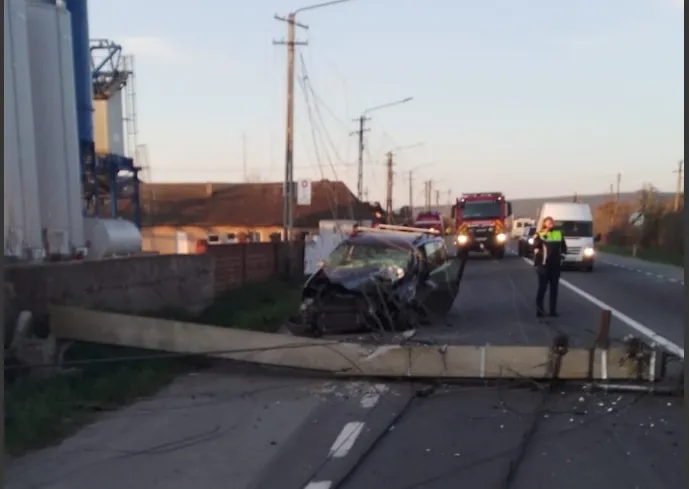 Accident rutier în Bonțida, județul Cluj: un tânăr a ajuns la spital după ce autoturismul său a lovit un stâlp de electricitate