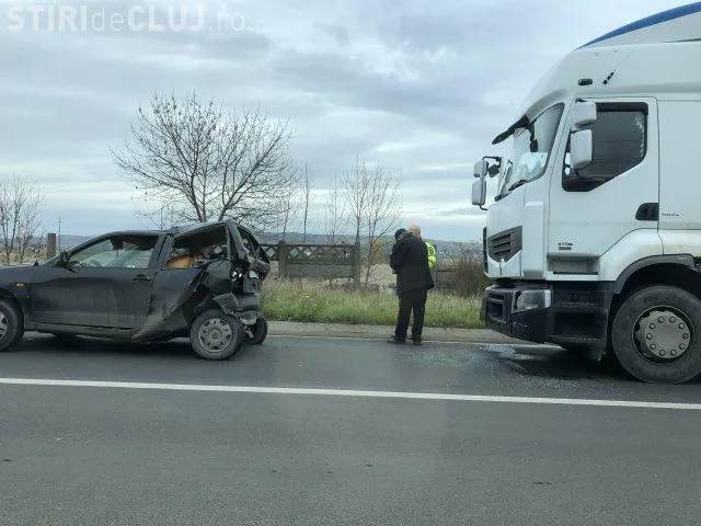 CLUJ: Accident la Dej. Un TIR a făcut praf un autoturism oprit la calea ferată FOTO