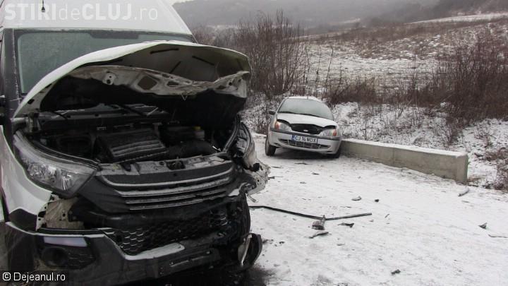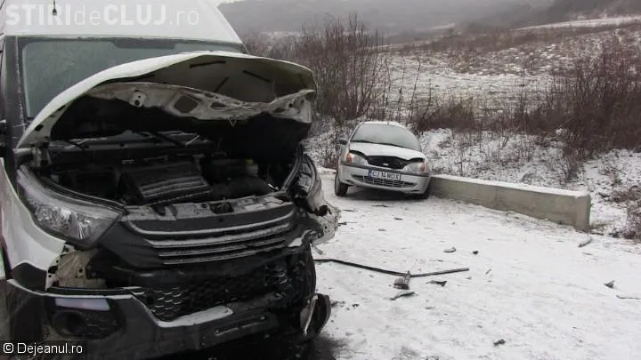 Un șofer a derapat pe drum, s-a răsucit și a intrat direct într-o dubă. Șoseaua nu fusese curîțată de zăpadă, ceea ce a contibuit la producerea accidentului.