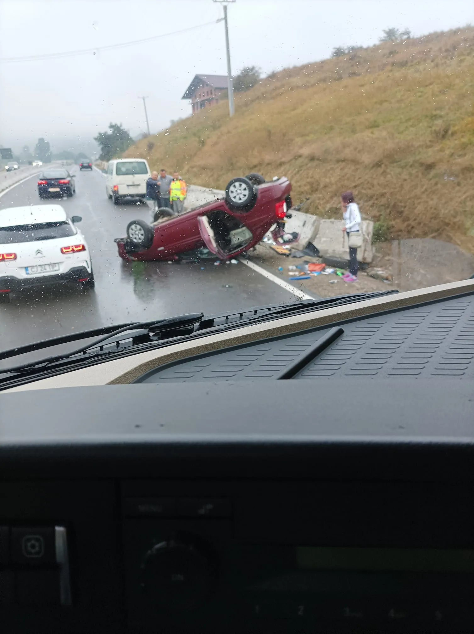 Cluj: Accident rutier la urcare în Feleac. Mașina a ajuns cu roțile în sus - FOTO