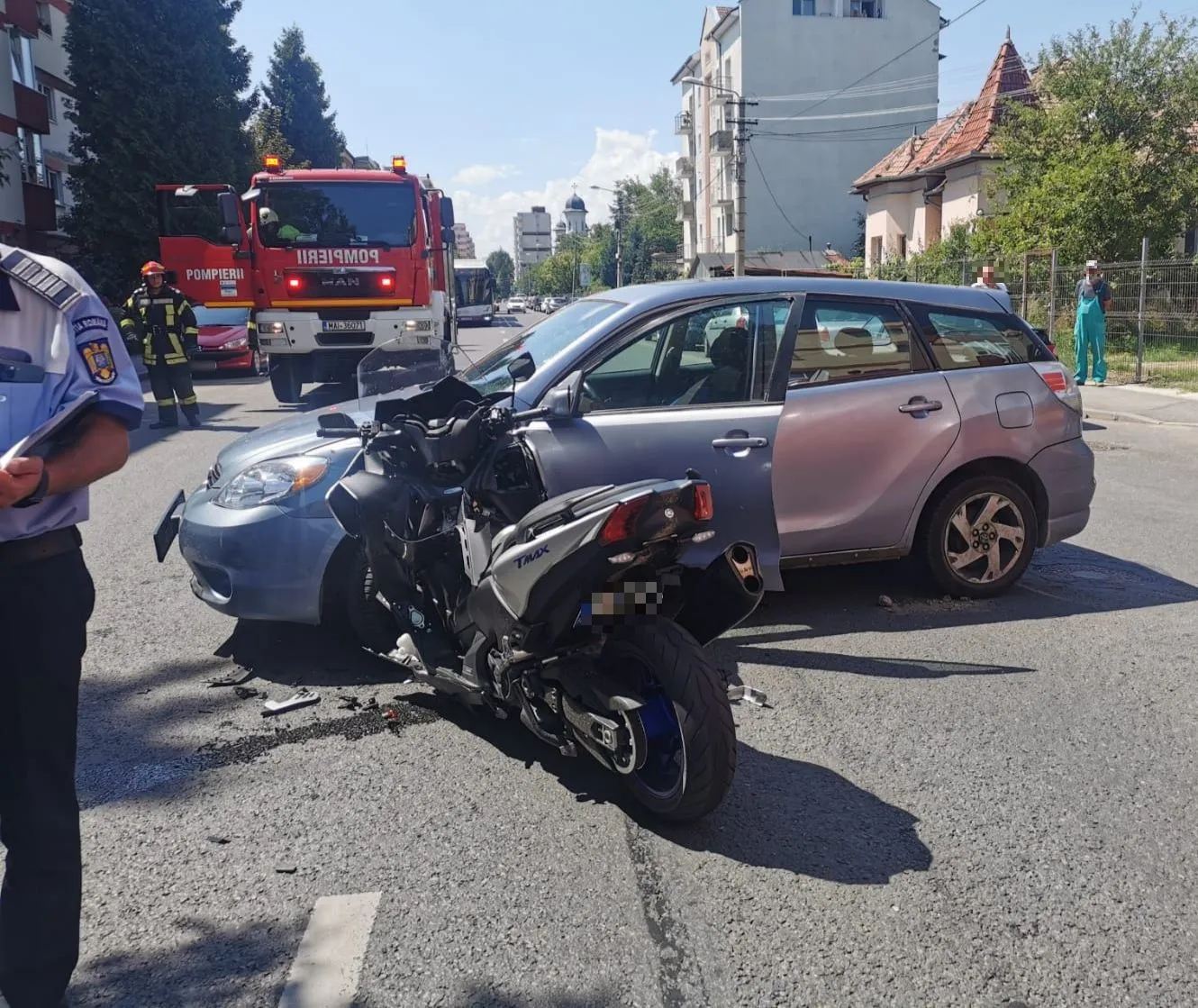 „Accident rutier produs în jurul orei 13.00, între un autoturism și o motocicletă, la intersecția străzilor Bihorului – Fântânele.