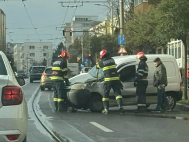 Din primele informații, o mașină a fost avariată puternic după impactul cu un alt autoturism.