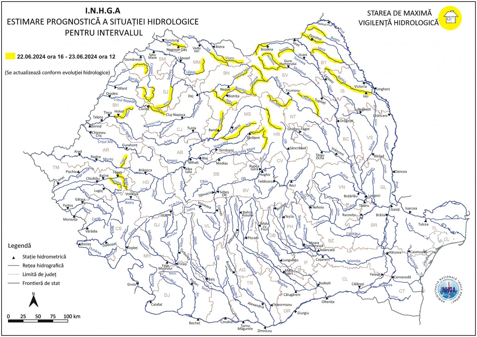 În intervalul 22.06.2024 ora 16:00 – 23.06.2024 ora 12:00 pe râurile din bazinele hidrografice: Vişeu – bazin superior şi afluenţi bazin mijlociu şi inferior, Iza – bazin superior şi afluenţi bazin mijlociu şi inferior, Lăpuş – bazin superior şi afluenţi bazin mijlociu şi inferior (judeţul Maramureş), Tur – bazin superior şi afluenţi bazin mijlociu şi inferior (judeţul Satu Mare), Someşul Mare – bazin superior şi afluenţi bazin mijlociu şi inferior (judeţul Bistriţa Năsăud), Someş – afluenţii mici aferenţi sectorului aval S.H. Dej (judeţele: Cluj, Sălaj, Maramureş şi Satu Mare), Crasna – bazin superior şi afluenţi bazin mijlociu şi inferior (judeţele: Sӑlaj şi Satu Mare), Ier – bazin superior şi afluenţi bazin mijlociu şi inferior (judeţele: Satu Mare şi Bihor), Barcău – bazin superior şi afluenţi bazin mijlociu şi inferior (judeţele: Sălaj şi Bihor), Crişul Repede – bazin amonte S.H. Ciucea şi afluenţii aferenţi sectorului aval S.H. Ciucea (judeţele: Cluj şi Bihor), Crişul Negru – afluenţii aferenţi sectorului aval S.H. Suştiu (judeţele: Bihor şi Arad), Mureş – bazin amonte S.H. Topliţa şi afluenţii aferenţi sectorului aval S.H. Topliţa – amonte S.H. Luduş (judeţele: Harghita, Mureş şi Bistriţa Năsăud), Târnava Mică – bazin amonte S.H. Sărăţeni şi afluenţii aferenţi sectorului aval S.H. Sărăţeni – amonte S.H. Târnăveni (judeţele: Harghita şi Mureş), Târnava Mare – bazin amonte S.H. Odorheiu Secuiesc şi afluenţii aferenţi sectorului aval S.H. Odorheiu Secuiesc – amonte S.H. Mediaş (judeţele: Harghita, Mureş, Braşov şi Sibiu), Mureş – afluenţii aferenţi sectorului aval S.H. Brănişca (judeţele: Hunedoara şi Arad), Bega – bazin amonte S.H. Făget şi afluenţii aferenţi sectorului aval S.H. Făget – amonte S.H. Remetea (judeţul Timiş), Bistriţa – bazin amonte S.H. Cârlibaba şi afluenţii aferenţi sectorului aval S.H. Cârlibaba – amonte S.H. Frunzeni (judeţele: Suceava, Harghita şi Neamţ), Moldova – bazin superior şi afluenţi bazin mijlociu şi inferior (judeţele: Suceava şi Neamţ), Suceava – bazin superior şi afluenţi bazin mijlociu şi inferior (judeţul: Suceava), Jjia – bazin superior şi afluenţi bazin mijlociu şi inferior, Prut – afluenţii aferenţi sectorului amonte confluenţă cu râul Jijia (judeţele: Botoşani şi Iaşi).” se arată in Avertizarea emisă.