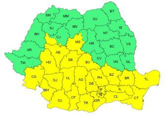 „În Oltenia, Muntenia, Dobrogea, cea mai mare parte a Transilvaniei și sudul Banatului vor fi perioade cu instabilitate atmosferică accentuată. Aceasta se va manifesta prin averse torențiale, frecvente descărcări electrice, intensificări ale vântului (viteze de 50...70 km/h), vijelii și căderi de grindină. În intervale scurte de timp sau prin acumulare cantitățile de apă vor fi de 20...30 l/mp și izolat de peste 50 l/mp. În funcţie de evoluţia şi intensitatea fenomenelor meteorologice, Administraţia Naţională de Meteorologie va actualiza prezentul mesaj” transmite ANM