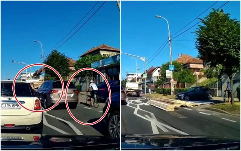 Cluj: Biciclist la un pas să fie STRIVIT pe Corneliu Coposu de lemnele căzute de pe o camionetă - VIDEO surprins LIVE