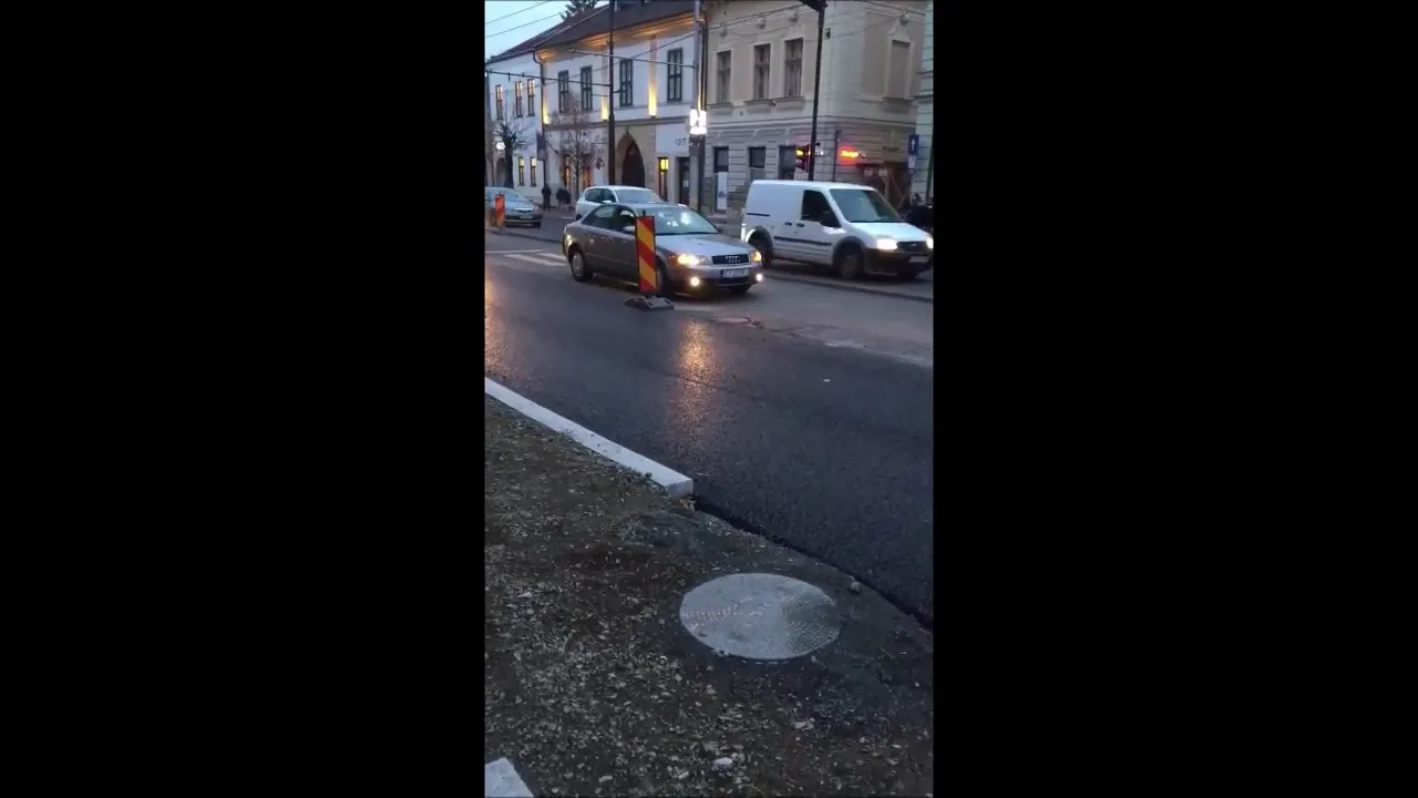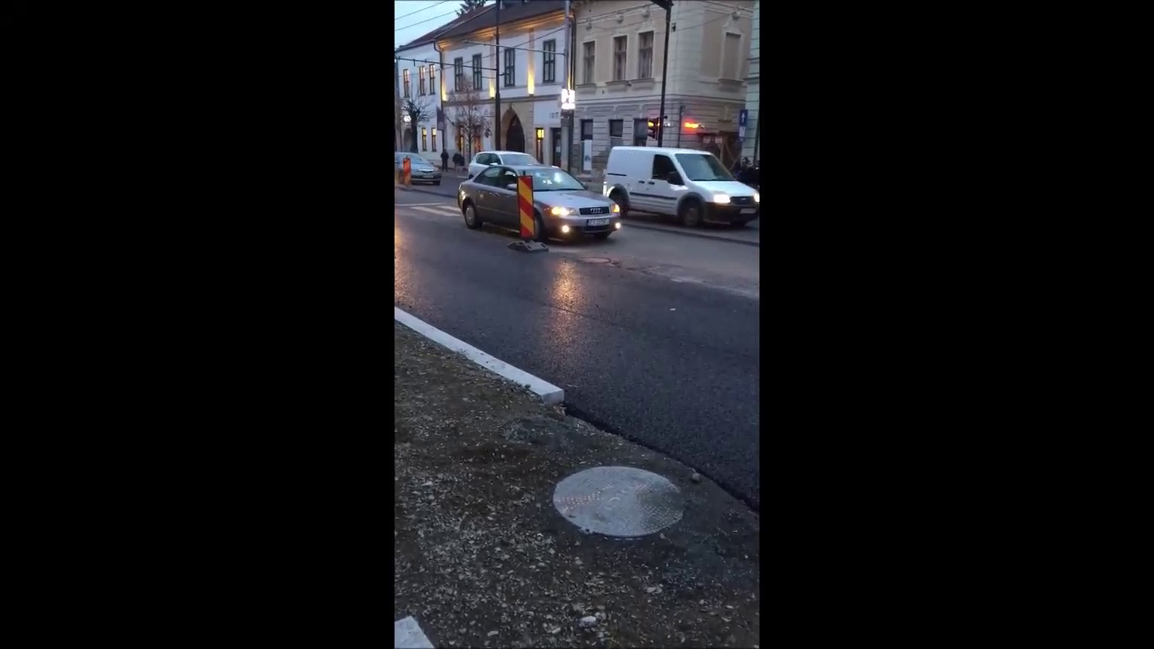 Un livrator a fost filmat pe Bulevardul 21 Decembrie 1989, sâmbătă seara, când a parcat în mijlocul drumului, pe avarii, ca să ia o comandă.