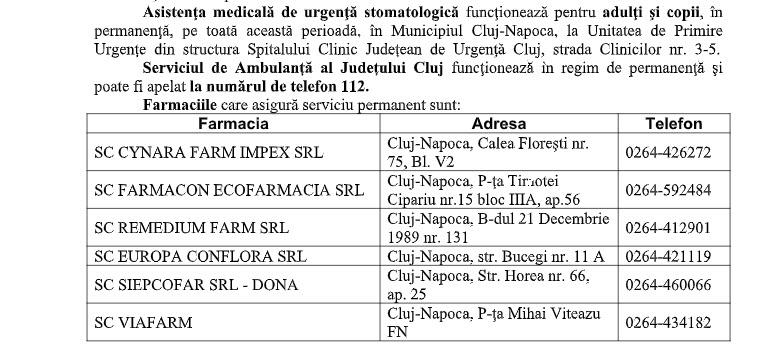 În Municipiul Cluj-Napoca, pentru populaţia adultă urgenţele medico-chirurgicale se vor adresa Unităţii de Primire Urgenţe din structura Spitalului Clinic Judeţean de Urgenţă Cluj, strada Clinicilor nr. 3-5, iar pentru copii la Unitatea de Primire Urgenţe din structura Spitalului Clinic de Urgenţă pentru Copii Cluj-Napoca, strada Moţilor nr. 68.