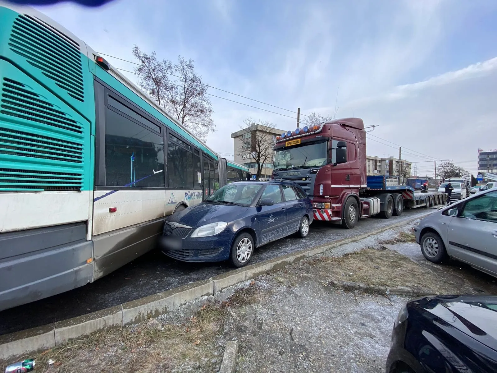 Un accident de circulație s-a produs pe Bulevardul Muncii. O mașină de poliție, un autobuz CTP și un tractor au fost implicate, dar din fericire, nimeni nu a fost rănit. Drumul nu era curățat și chiar și mașina poliției s-a dus ca o sanie pe drum.