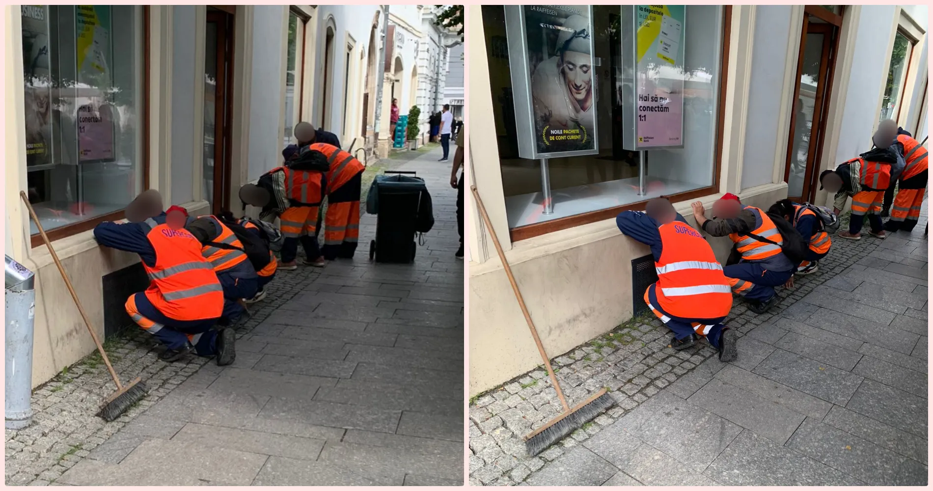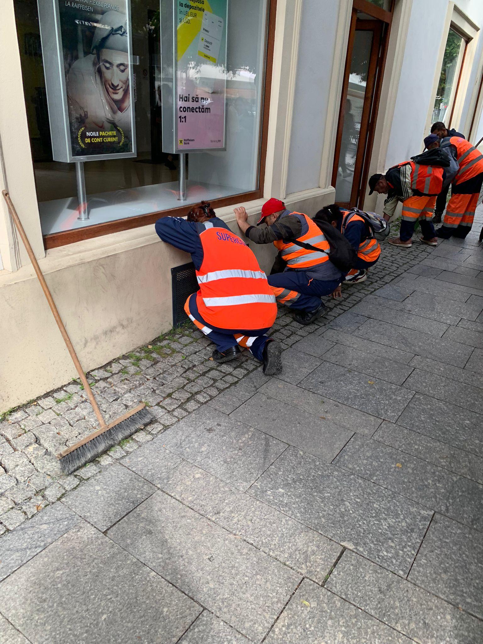 Scenele au fost fotografiate în Piața Unirii. Angajații erau în genunchi și se chinuiau să culeagă iarba și buruienile. Spunem se chinuiau, pentru că pe unde au trecut nu se vedea nicio diferență.