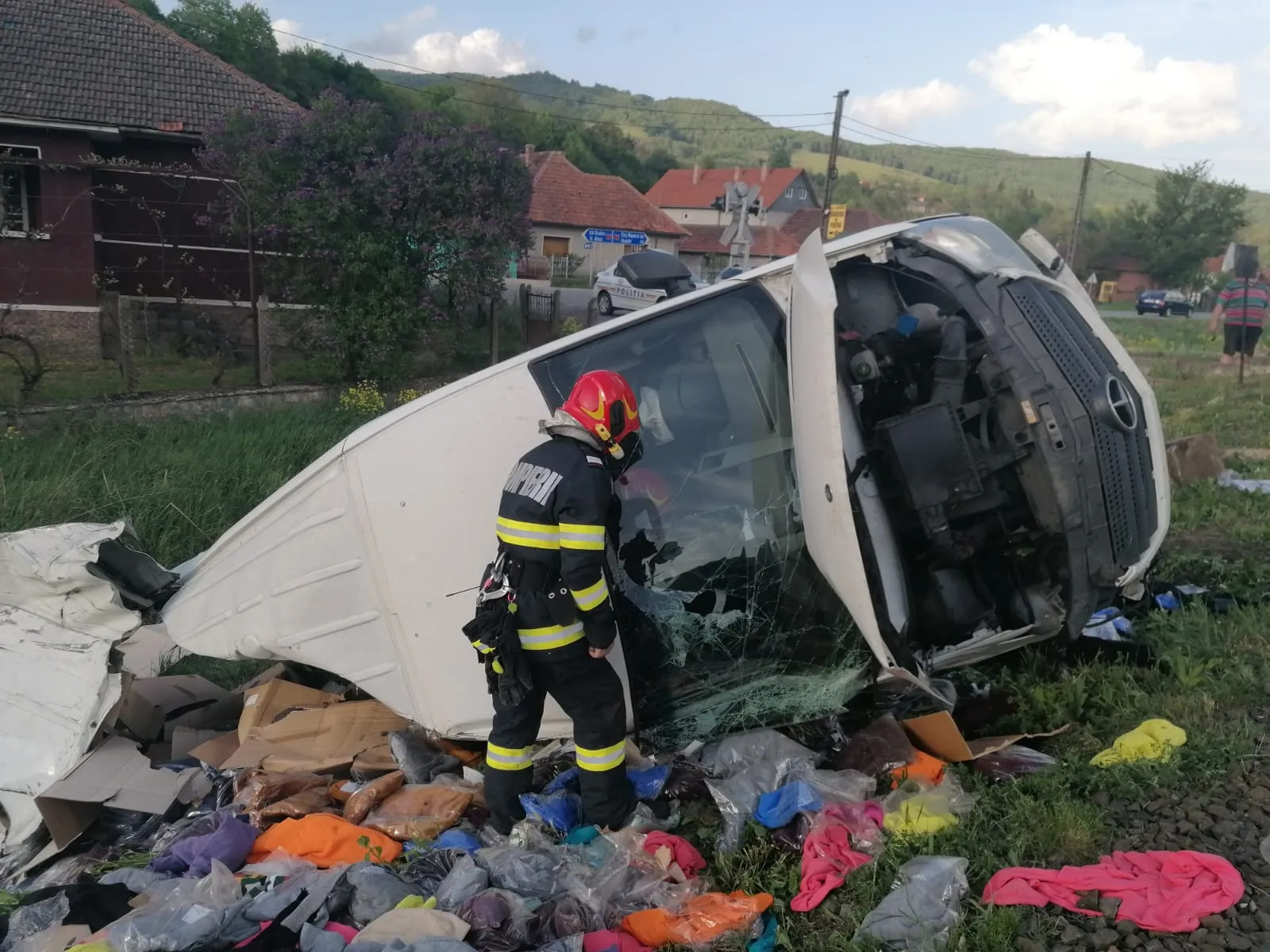 Pompierii au găsit la locul accidentului o autoutilitară răsturnată și șoferul, de 40 de ani, ieșit din aceasta.