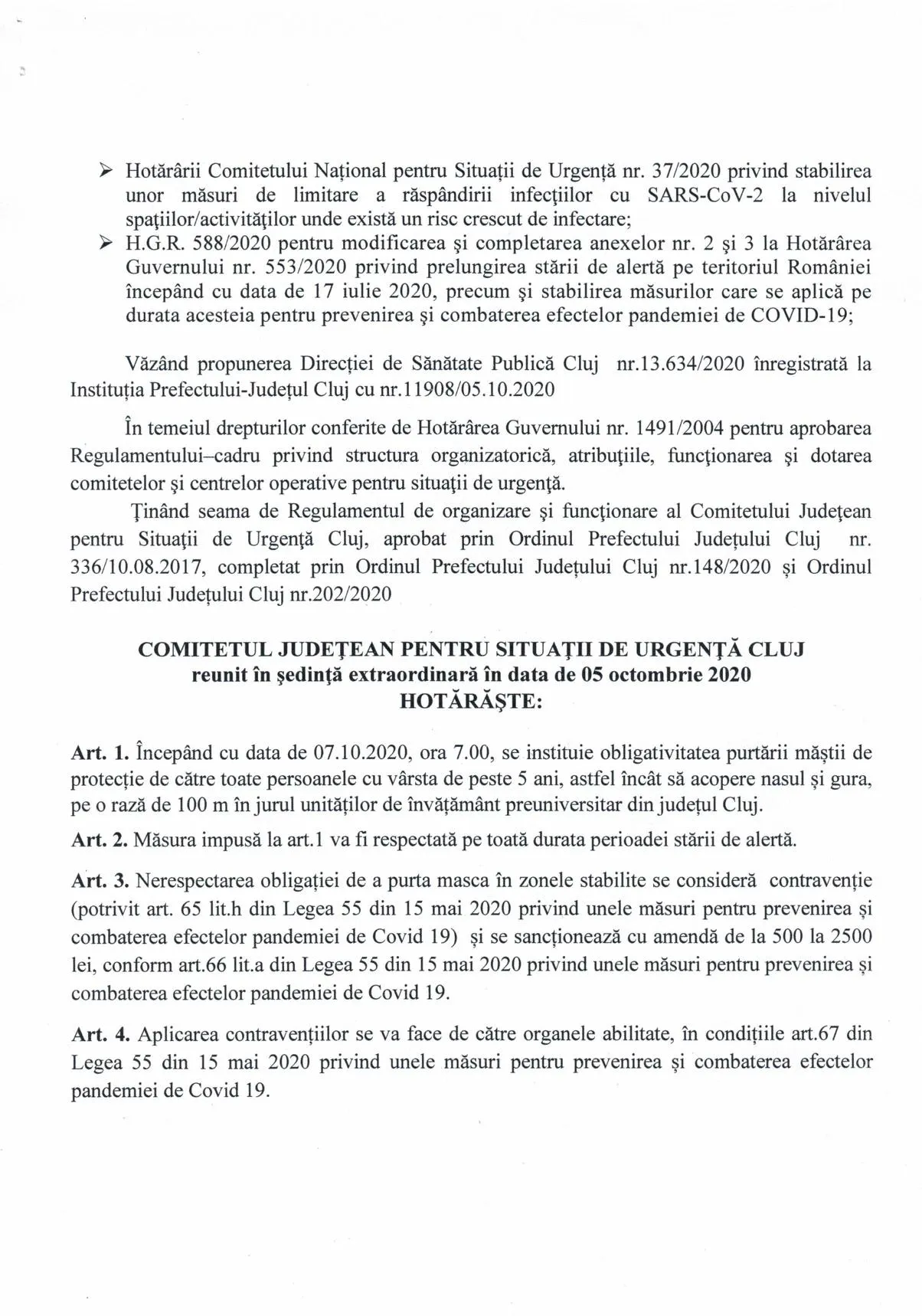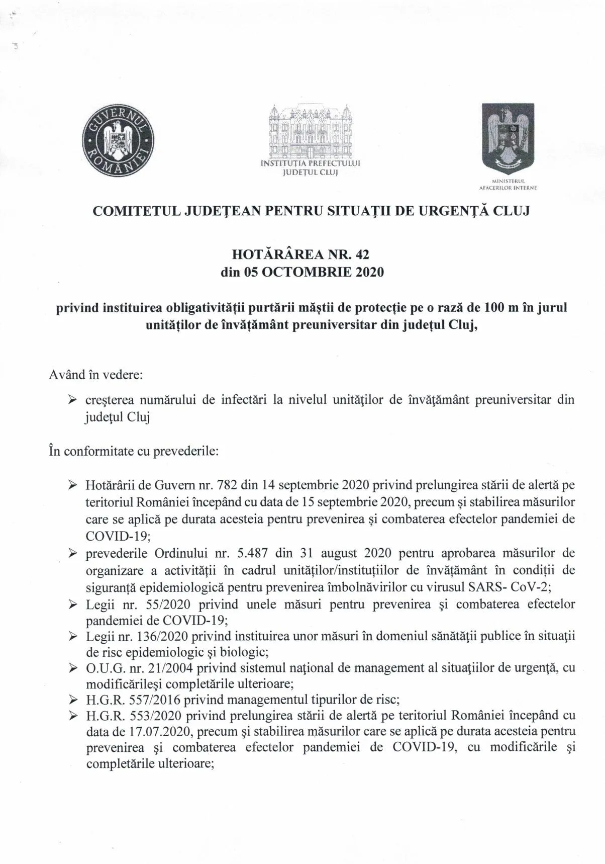 Clujenii care trec la mai puțin de 100 de metri de o școală trebuie să poarte mască, începând de marți dimineața, conform Hotărîrii 42 a Comitetului Județean pentru Situații de Urgență (CJSU) Cluj.