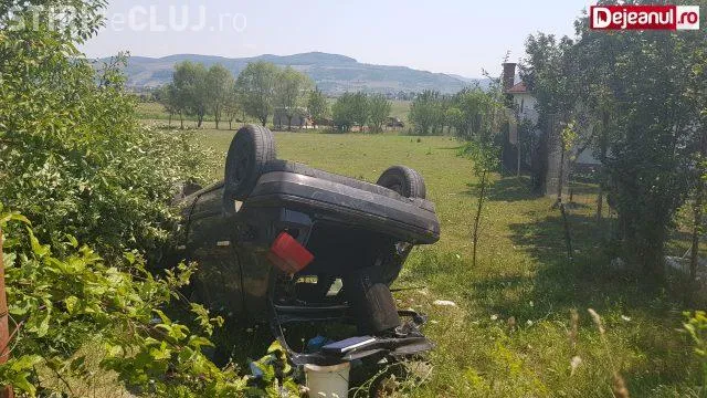 Un bărbat din Dej şi fiul său au ”zburat” cu maşina de pe şosea, după ce un şofer, care circula pe sens opus, a intrat în depăşire şi a patruns pe sensul lor de mers. Pentru a evita impactul, dejeanul a tras stânga de volan, însă a pierdut controlul volanului, a ajuns pe contrasens, a rupt un indicator rutier, un podeţ, după care maşina a rupt gardul unei case şi câţiva pruni şi s-a răsturnat pe plafon, scrie Gherla Info.
