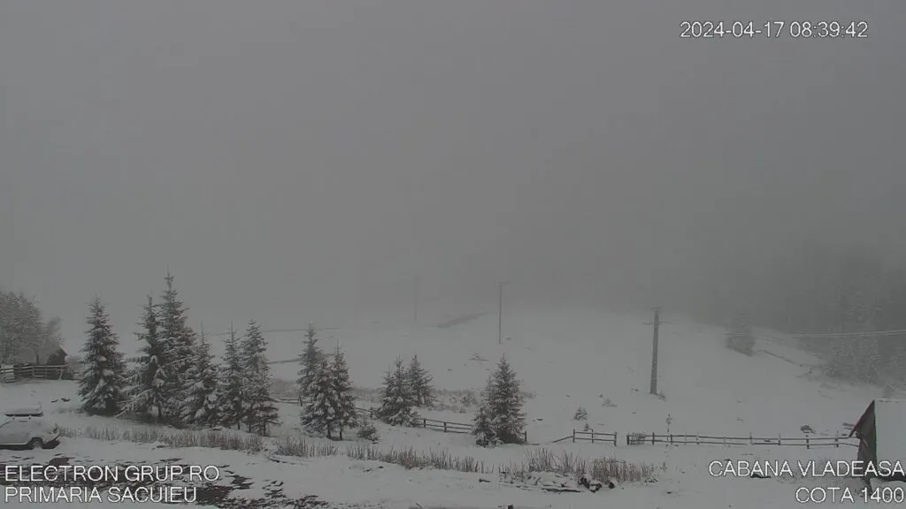 În cursul nopții de marți spre miercuri, vremea a adus ninsori puternice și viscolite în regiunea montană a județului Cluj, mai precis pe Vârful Vlădeasa. Camerele LIVE din zonă au surprins stratul proaspăt de zăpadă care acoperea peisajul în dimineața următoare.
