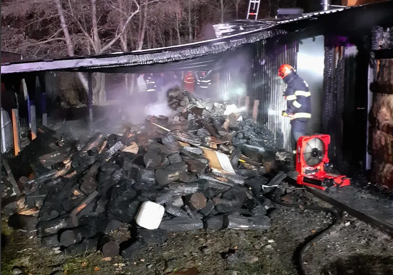Focul a afectat anexa unde funcționa o centrală pe lemne și s-a extins rapid la o terasă, distrugând o suprafață totală de aproximativ 30 de metri pătrați. Din cauza căldurii intense, un container aflat în apropiere a fost parțial deteriorat, însă intervenția promptă a pompierilor a reușit să împiedice extinderea incendiului la cabana de lemn, protejând astfel clădirea principală de pagube mai grave.