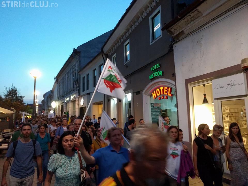 Protestul de la Cluj a început la ora 19.00, în Piața Unirii, și a continuat cu un marș pe străzile orașului. Protestul nu a fost autorizat, dar probabil, se tem unii participanții, Poliția ”a căutat nod în papură” pentru ca pe viitor să nu îi mai lase să mărșăluiască pentru că ”fac probleme”.
