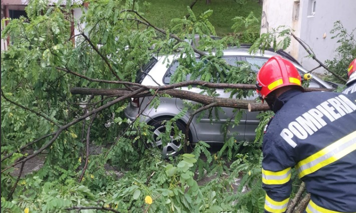 O mașină parcată pe Aleea Băișoara din Cluj-Napoca a fost avariată, după ce un copac a căzut peste ea.