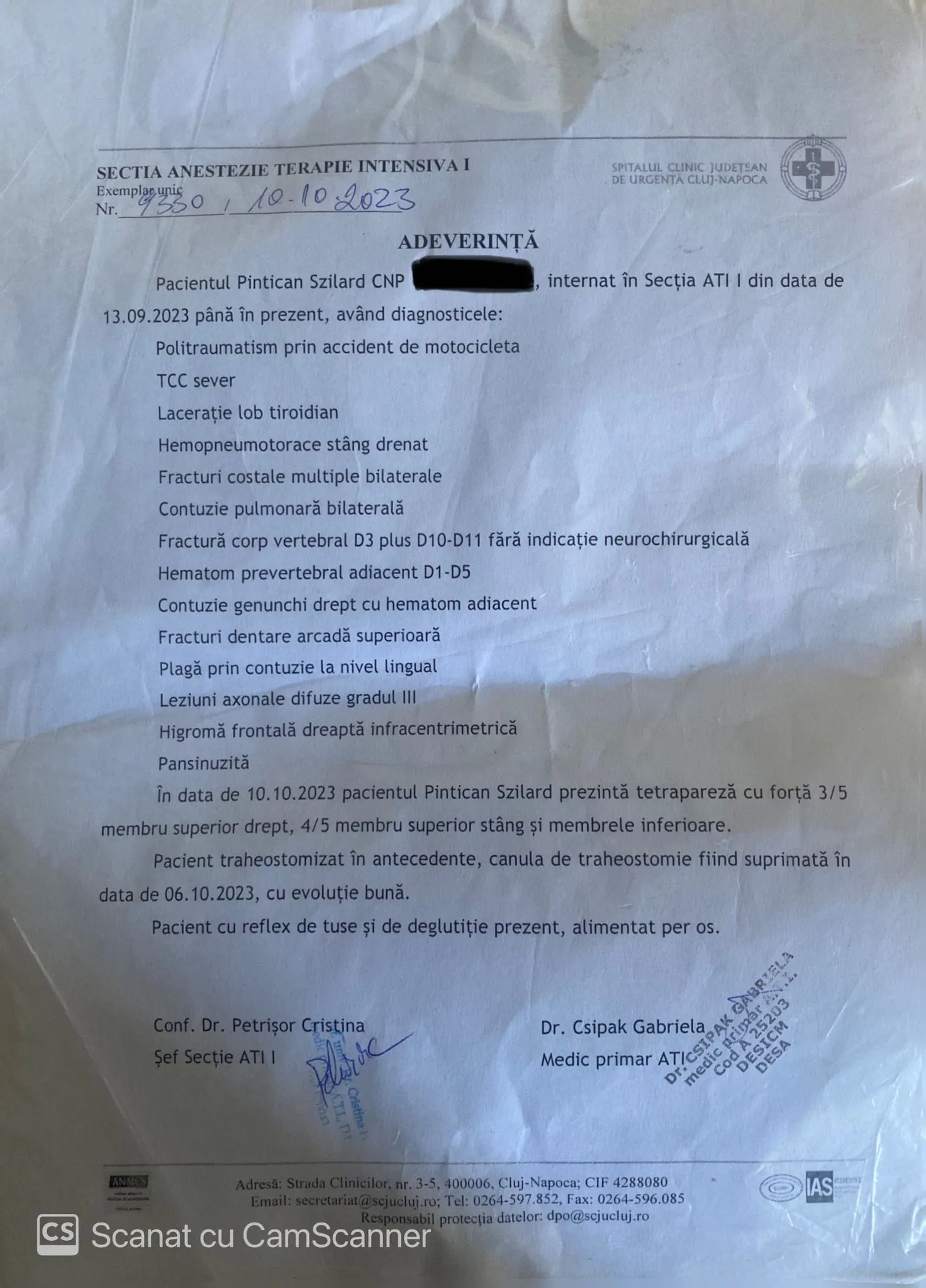 În urma evenimentului, conducătorul motociclului a fost transportat la spital pentru mai multe investigații, neputând fi testat cu aparatul etilotest. Testarea conducătorului auto a indicat rezultat negativ”, precizează Poliția Cluj.