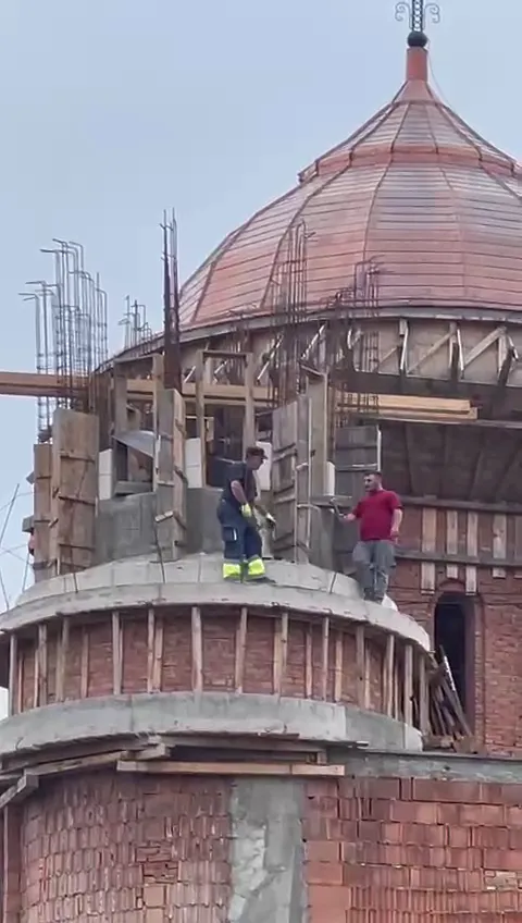 În imagini se vede cum cei doi muncitori se plimbă pe o structură de beton, ce pare extrem de îngustă, și verifică un zid de beton ce a fost turnat. Cei doi nu au echipamente de siguranță și nici nu sunt legați cu vreun ham.