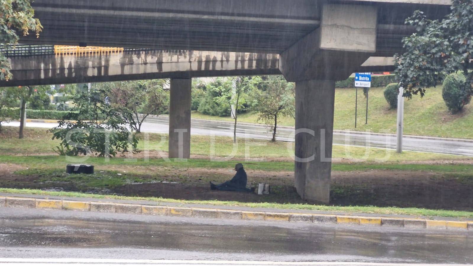Un om al străzii a fost surprins marți dimineața stând sub un pod din cartierul Mărăști, Cluj-Napoca, încercând să se adăpostească de ploaie. În imagine se poate observa că lângă el se află două plase, probabil conținând toate bunurile sale.
