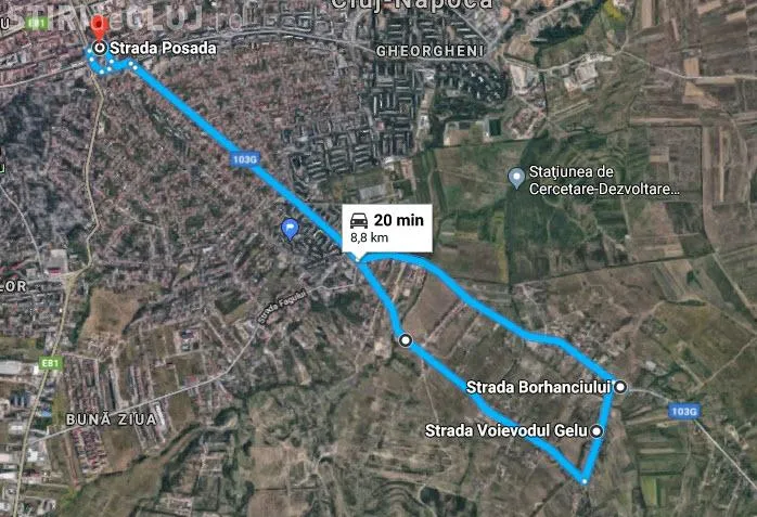 - Dus: Str. Posada, P-ta Baba Novac, Str. C-tin Brancusi, Str. Romul Ladea, Str. Voievodul Gelu – Str. Borhanciului;