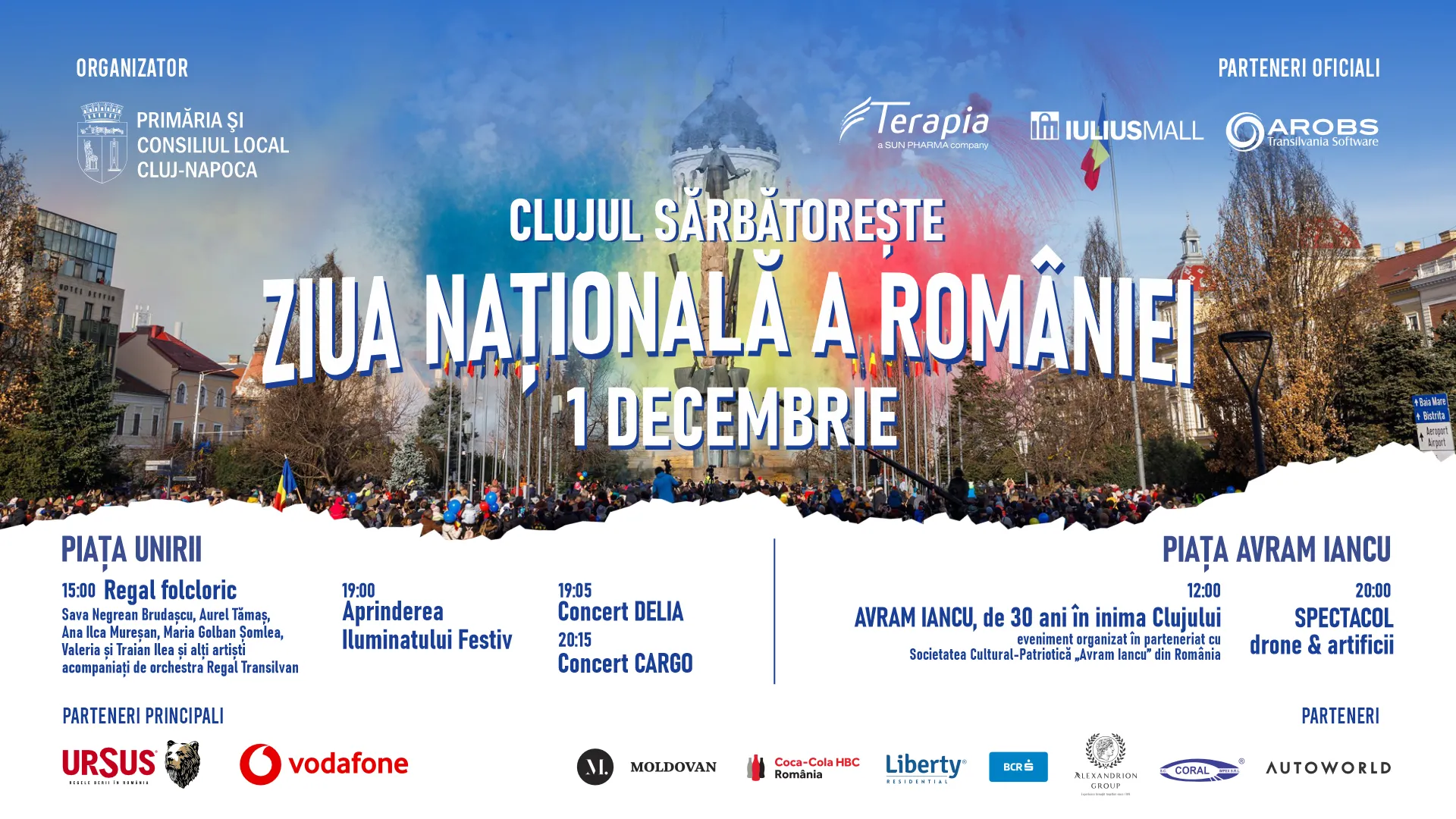 Primăria și Consiliul local Cluj-Napoca invită comunitatea clujeană și turiștii să sărbătorim împreună Ziua Națională a României. Manifestările din acest an se vor desfășura în Piața Mihai Viteazul, Piața Avram Iancu și Piața Unirii.