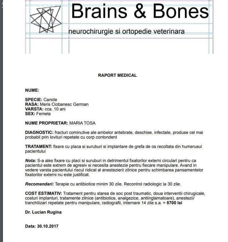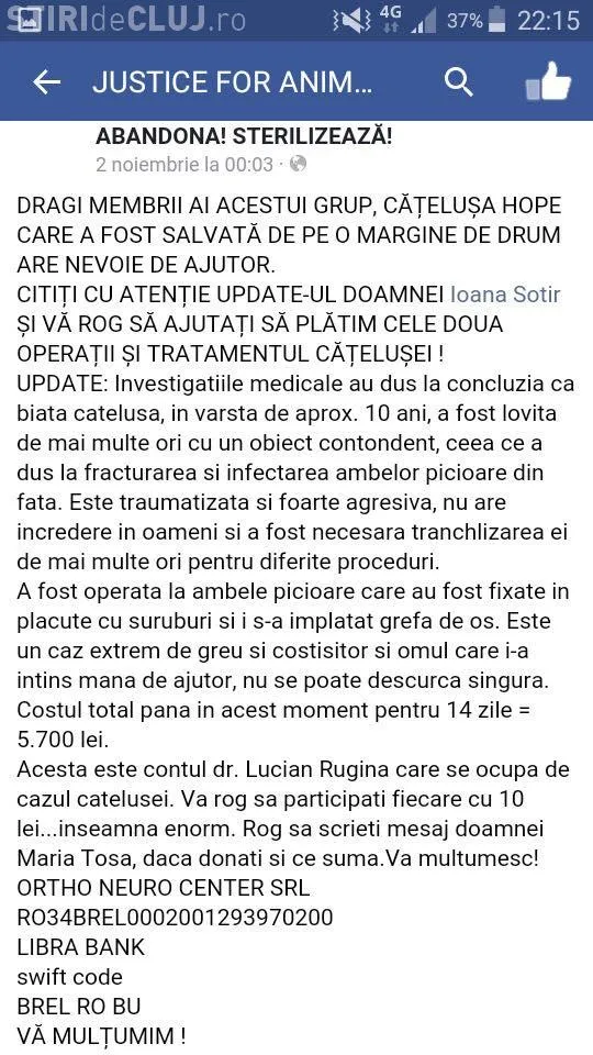 ”Buna ziua! Din nou postez niște imagini care ne rup sufletul celor iubitori de animale! Acesta cățelușa se numește HOPE și are vârsta de 10 ani! A suferit enorm, a fost lovită de nenumărate ori cu obiecte masive peste piciorușe încât a ajuns in situația de a suferi 2 operații foarte costisitoare ( 56 de milioane, in jurul acestei sume +,-) momentan a fost operata este bine, sub tratament și multă dragoste! Acesta cățelușa a fost salvata de doamna Maria Tosa ea se ocupa de acest caz și la rugămintea altei doamne cu suflet mare încercam sa mai strângem bănuți Pentru a achita operațiile ... câte 1 leu dacă donam fiecare ajutam acest catel și pe doamna care se ocupa de acest caz ... pentru ca are alți catei in grija și nu își permite plata operațiilor! Sau donat in jur de 800 de lei pana in momentul de fata dar nu este de-ajuns ... așa ca va rog sa ajutați și acum , repet cu 1 leu de fiecare ajutam acest suflet!! Mulțumesc anticipat!! Contul și restul detaliilor se afla in una din pozele de mai jos!”, potrivit paginii Protecția Animalelor Cluj.