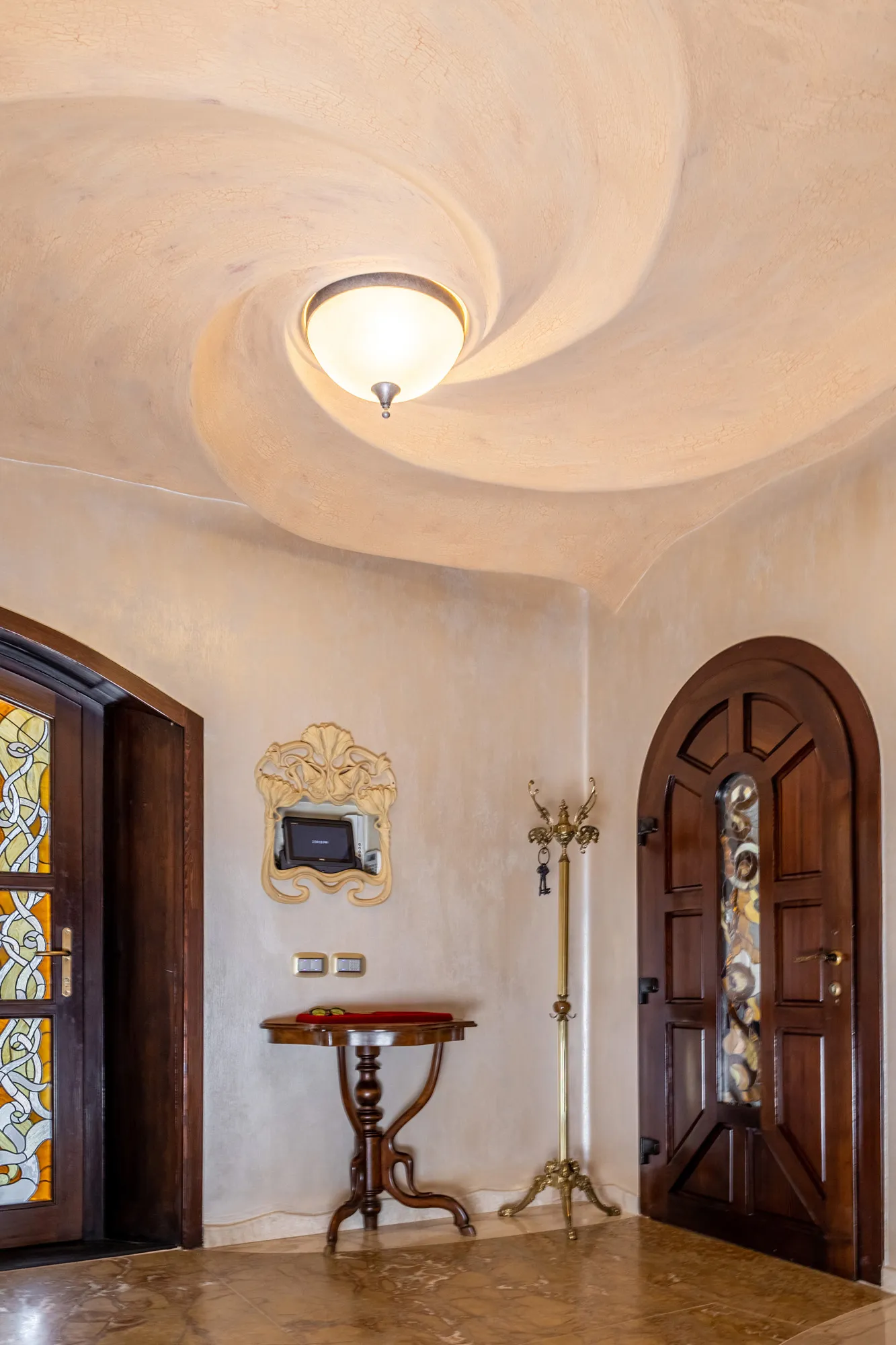 Ușa de la intrare, la fel ca tâmplăria din întreaga locuință, este din lemn Larice siberian și vitralii. Vitraliile care se regăsesc in întreaga locuință sunt realizate manual în tehnica Tiffany. În holul de la intrare ne întâmpină tavanul in forma de vortex.