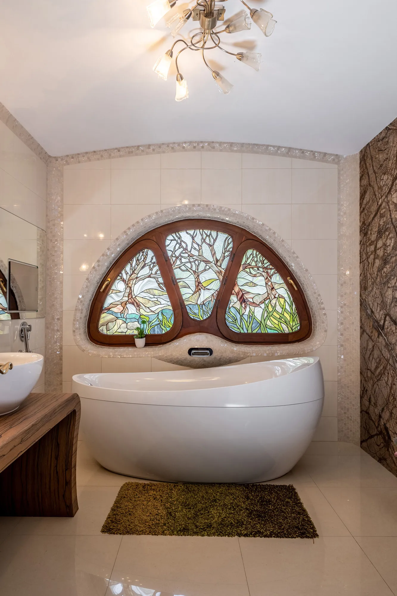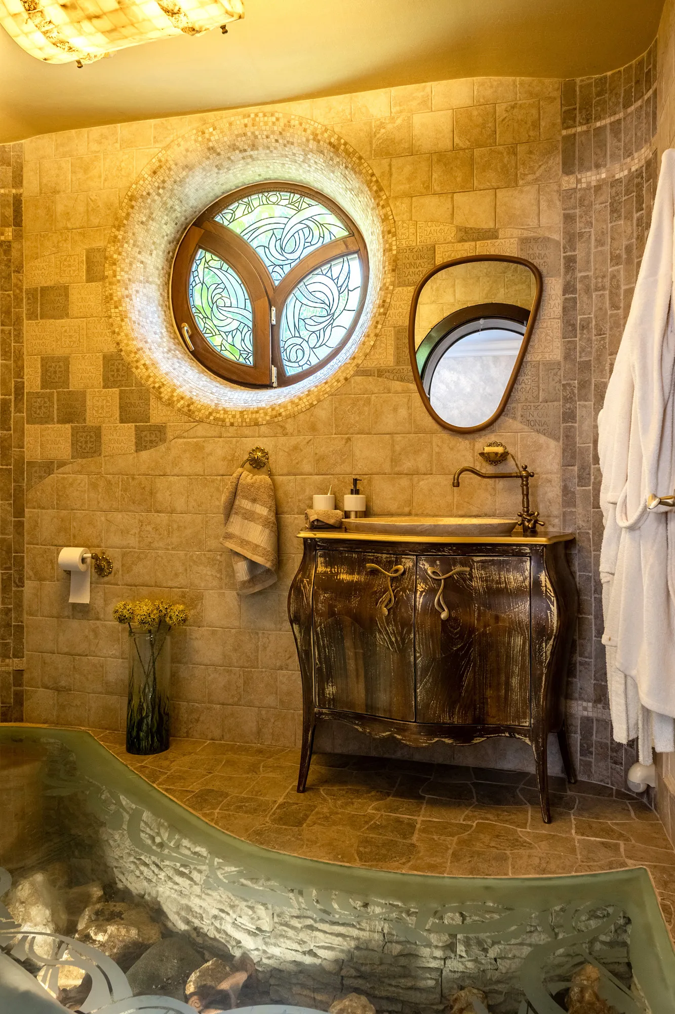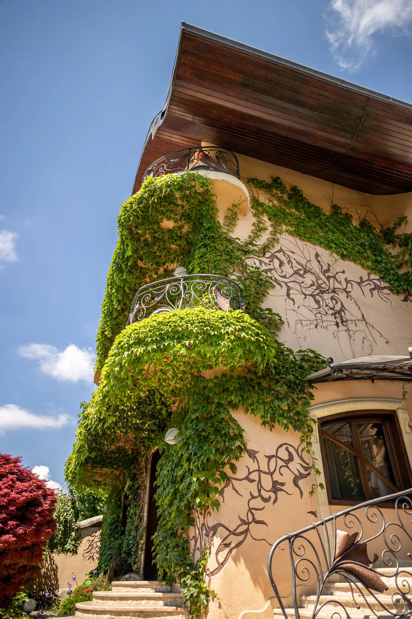 Soclul casei este sculptat manual și finisat cu praf de piatră care ne duc cu gândul la rădăcini de mangrove.