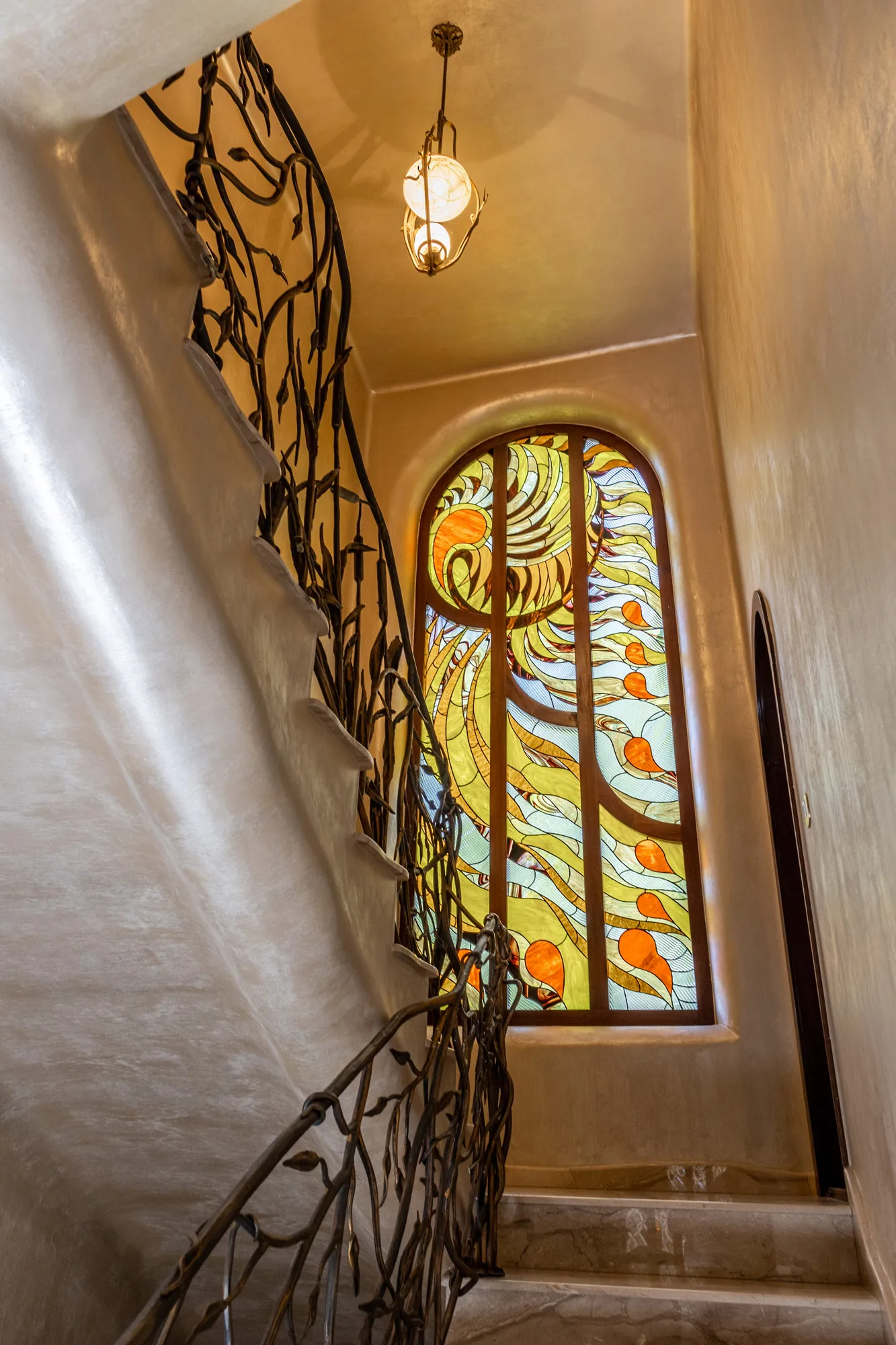 Formele sunt fluide, reprezentate prin linii curbe, vitraliile, fierul forjat transpun privitorul într-o lume feerică plină de rafinament și culoare, lumea filmului si a creațiilor artistice.