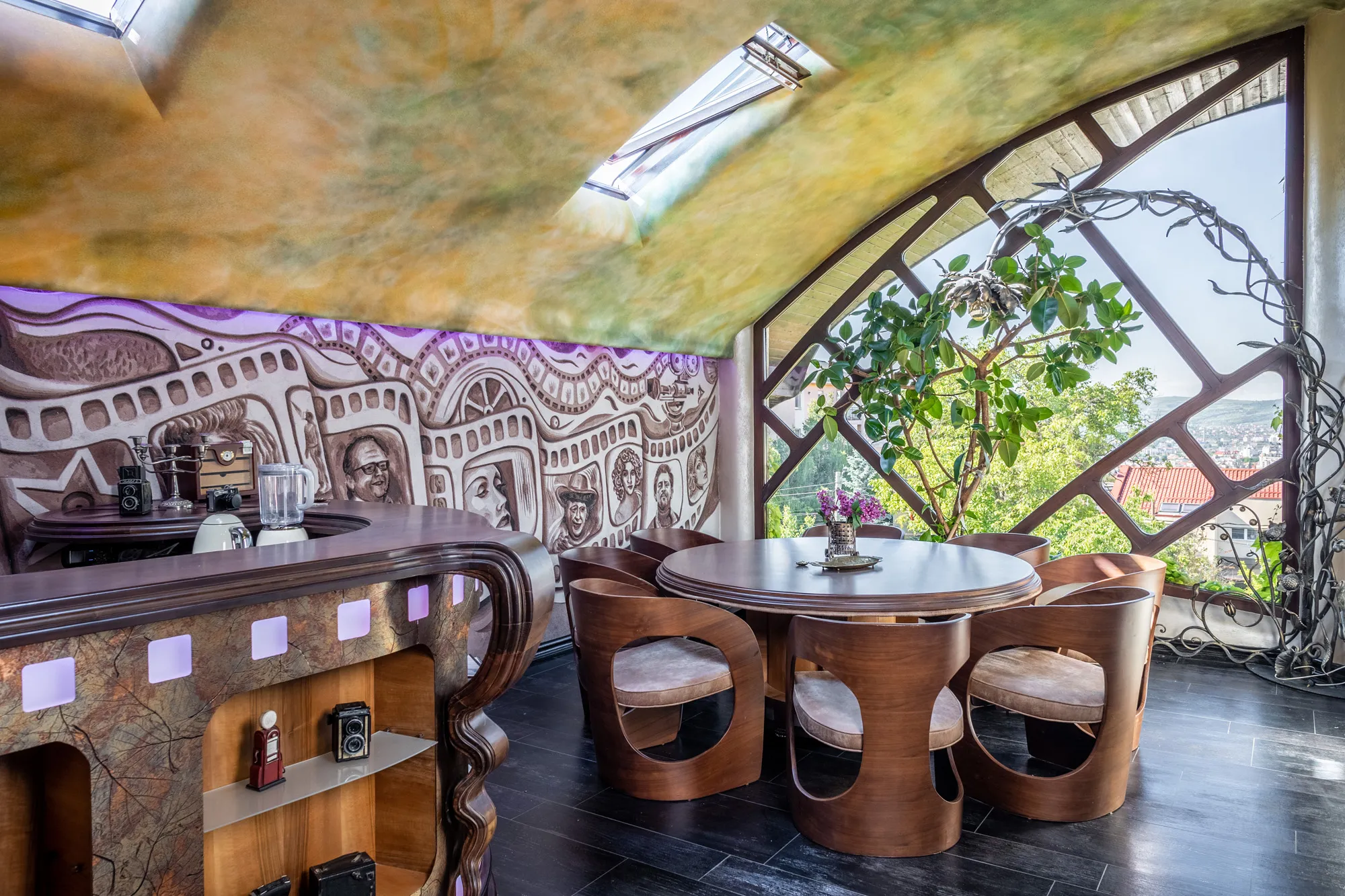 Tot la mansardă pe peretele din spatele barului regăsim o opera de artă realizată prin tehnica sgraffito, o tehnică de peste 200 de ani, in 7 straturi de tencuială de nuanțe diferite.